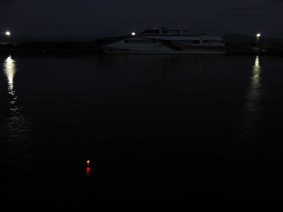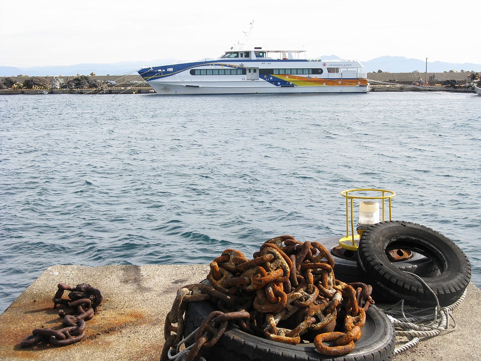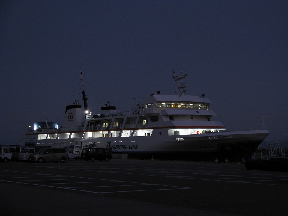 | 早速、港から歩いてすぐの、旅館「たてしま」にチェックインし、 晩メシまでに軽く釣りに出る。 港では、さっきまで乗っていた フェリー「ニューあわしま」が照明を点けていた。 |