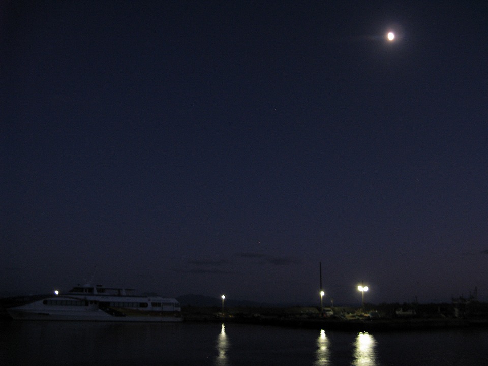 | お月様がきれい。 左下は、今年度は運行を終了した粟島汽船の高速船。 |
