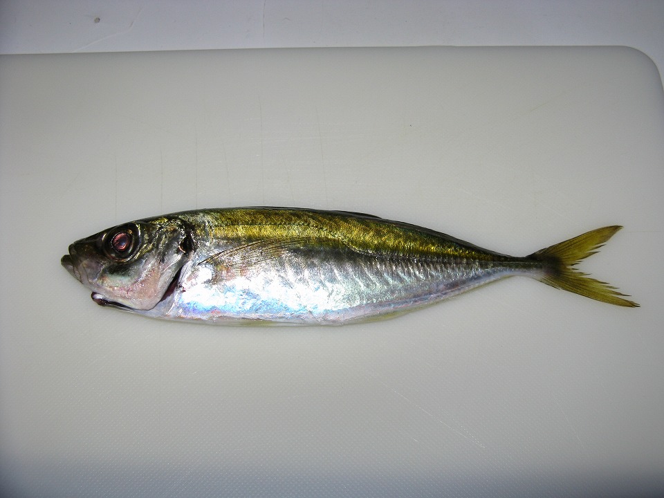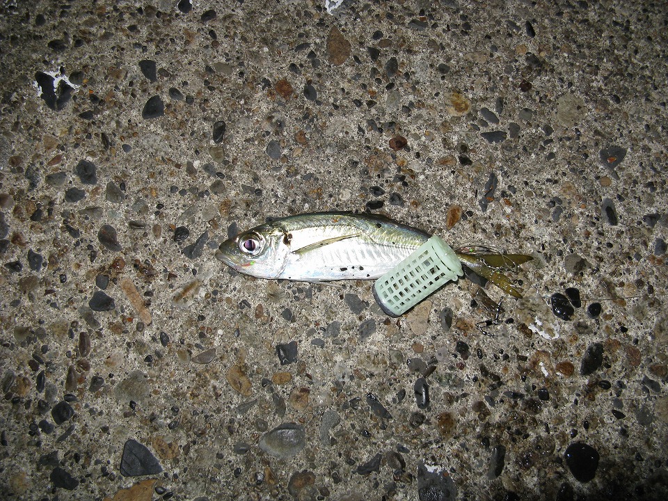 | すると程なくビビビンと当たりがきて、 小アジが釣れた。 今回の竿は短くて細いヤツだから、 こんな小アジでも、グググっとしなって、 なかなかにおもしろい。 コイツは辛うじて刺身にできる大きさだ。 |