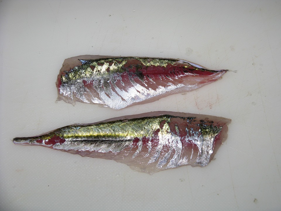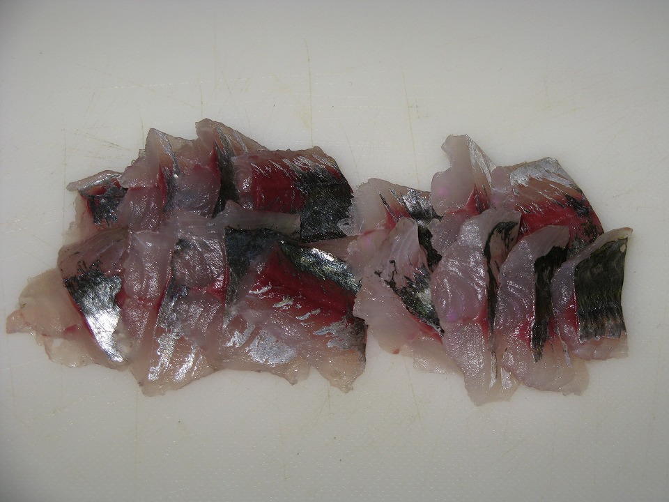 | きらっきらで、半透明の身が新鮮さの証だね (釣ってすぐなんだから当たり前か。)。 |