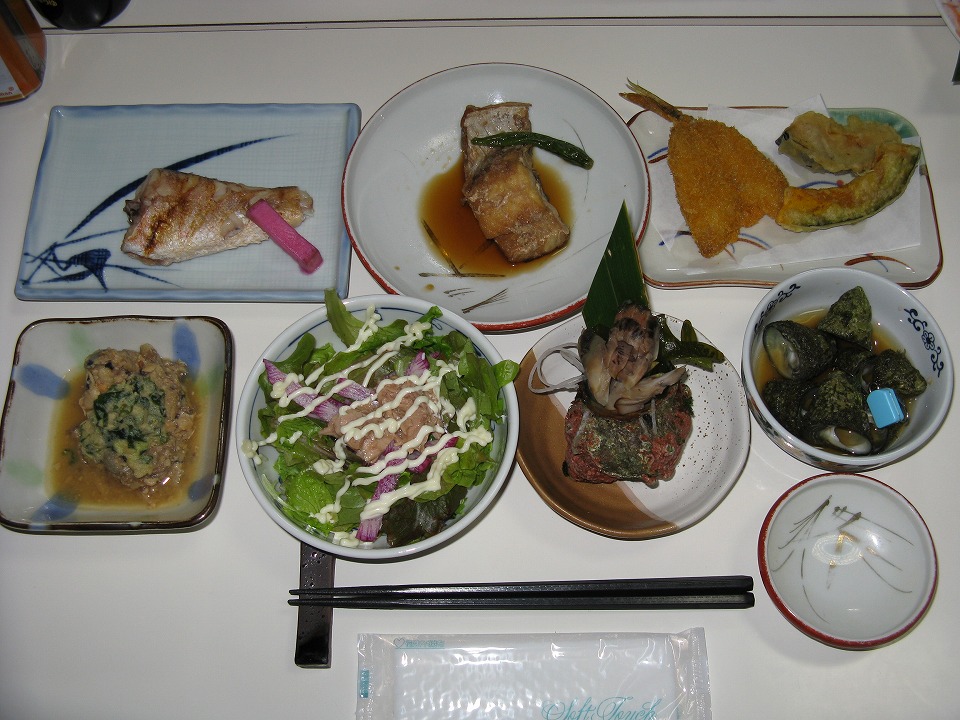 | 小アジは後で食すとして、 宿のメシだ。 海の幸がいっぱい! しかも、これだけではなかった。 |
