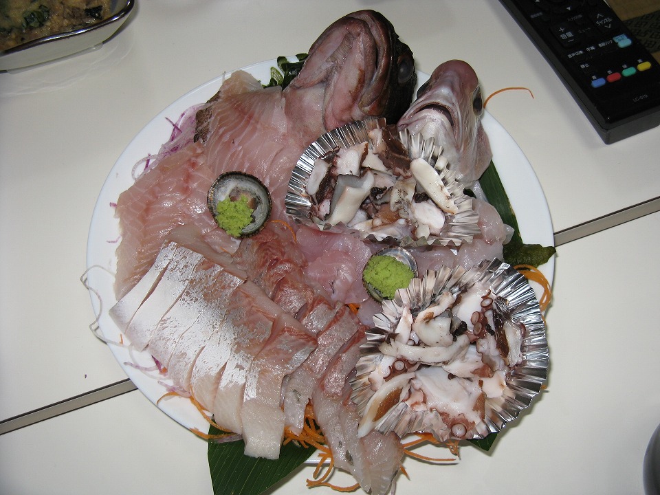 | なんと、キジハタ、ヒラマサ、それにアマダイの刺身、 そしてタコしゃぶまで付いたよ。 うめいうめい。 |