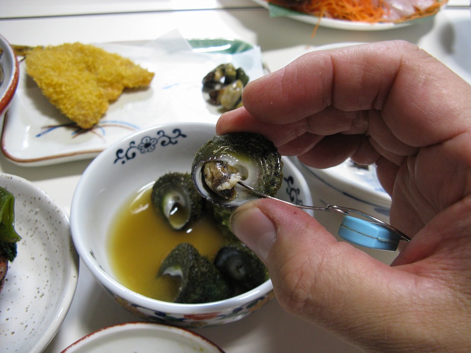 | シッタカの煮付けもあったが、 コイツは引っ張り出すのに少しコツがいる。 このコツを知らないと、 「貝殻が食卓に並んでいる」と思ってしまう(笑)。 |