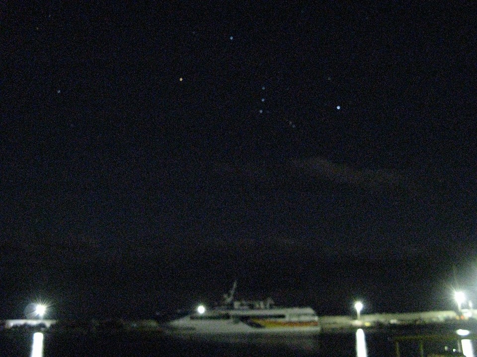 | さんざん呑み喰いしたってのに、 また釣りにきた。 オリオン座がきれいだったので撮影したが、 夜だし、コンデジしかなくて、ピントを合わせられなかったので、 こんな写真になっちゃったけど、 オリオン座は分かるよね(笑)。 しっかし、ピンぼけがひで~な~。 |