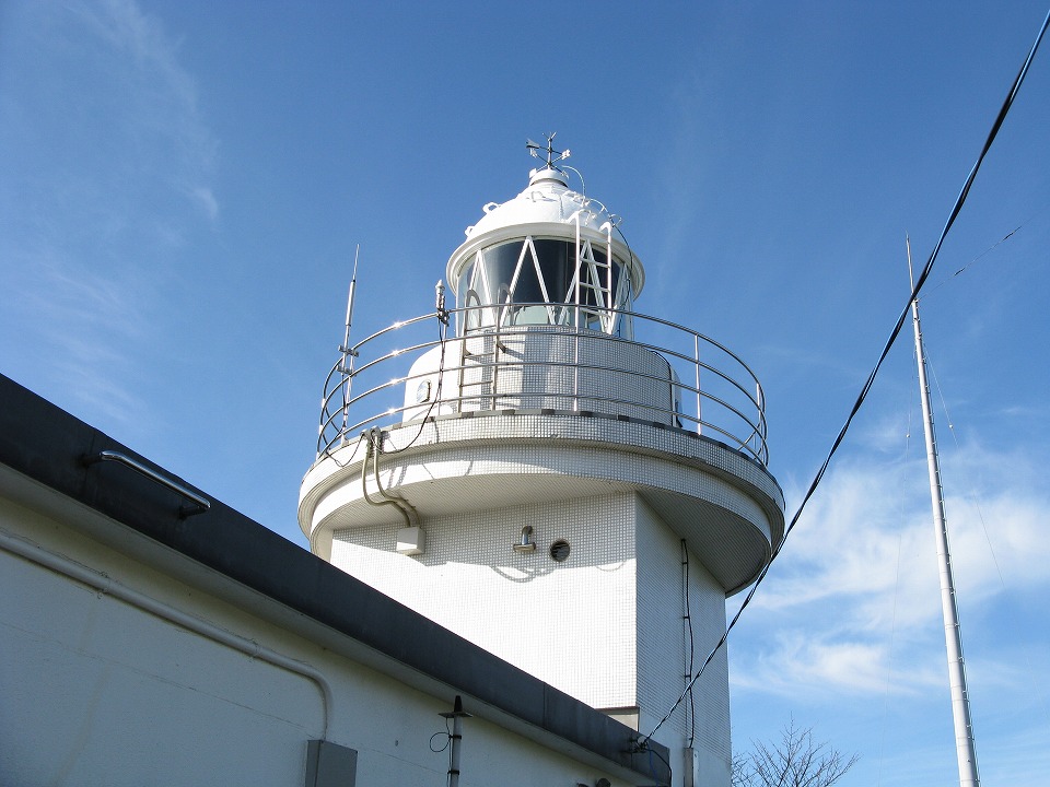 | ひと1人が通れるほどの階段(一部平坦路)を 腰痛と脊柱管狭窄症持ちのおっさん(ワタクシのことですね。) が、えっちらおっちら登ること(一部下ること)をしつつ 約18分で灯台に着いた。 11月の朝で風が強いのに、汗だくだ…。 標高の高さは273.9mで全国3位(ちなみに粟島最高地点。)、 光の届く距離は約42kmで全国2位 だそうな。 |
