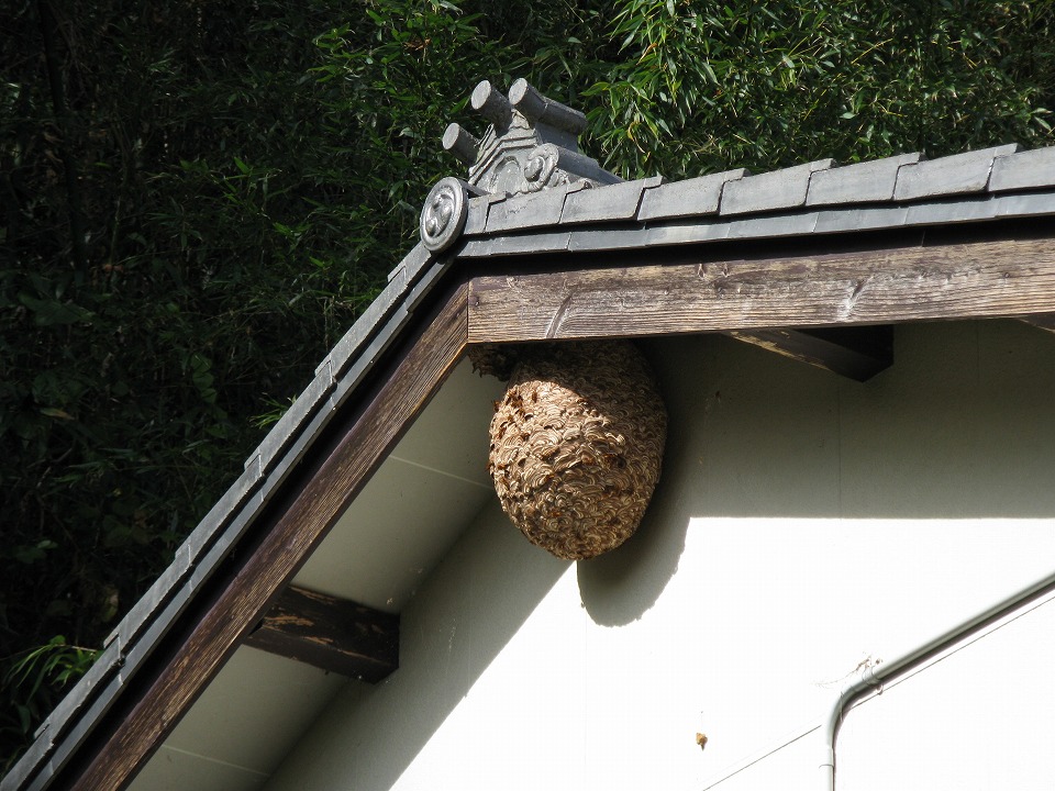 | 物置の屋根の下にスズメバチのでっかい巣があった。 駆除しないのかな。 蜂の巣を取るつもりかな。 |
