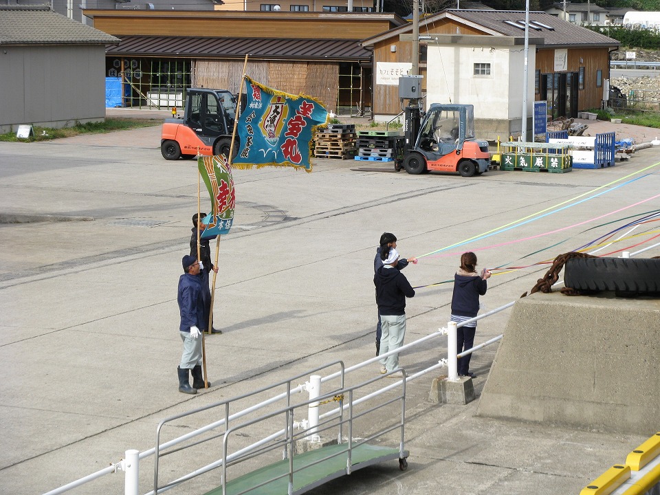 | さて、乗船手続きをして出港を待つ。 粟島名物(?)の大漁旗を振っての見送り。 俺は関係ないのに俺までうるうるしてくる。 こういうのは船ならではだよね。 |