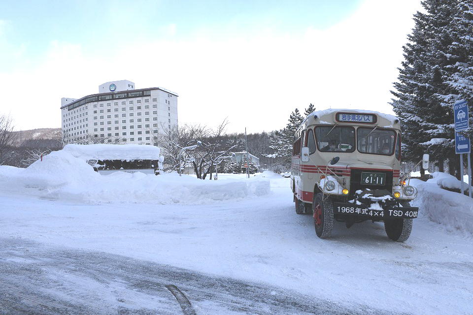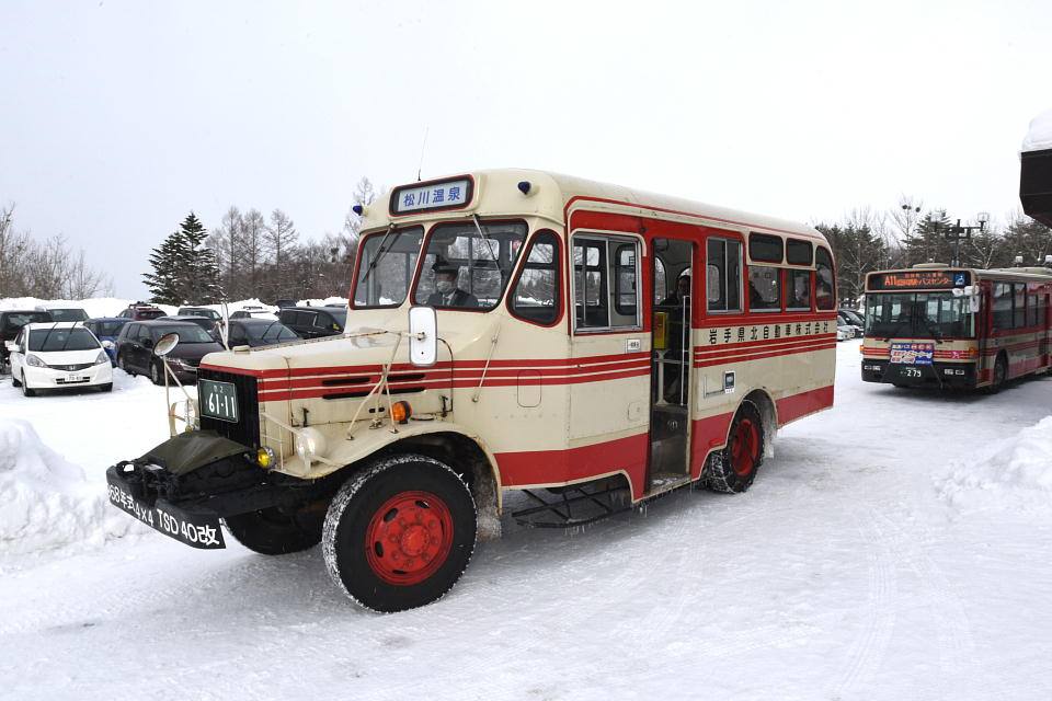 | さて、午後になり、 ボンネットバスがホテル前にスタンバっていた。 これから、盛岡からやってくる「松川温泉」行きのバスの 末端部分を担うんだね。 |