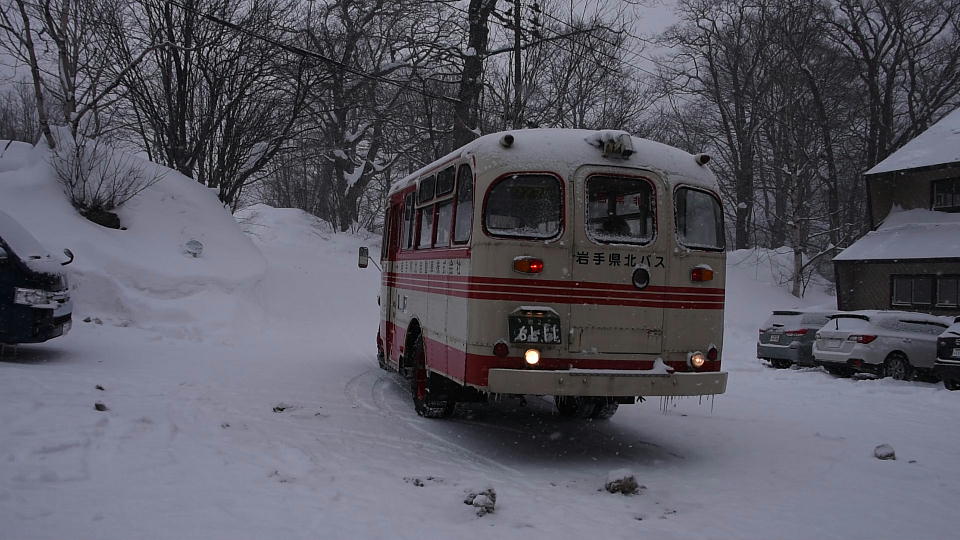 | と、取材を終えようとしたのだが、 急に松川温泉のバス停で最終便の撮影をしたくなり、 もう日が暮れかかっているのに、先回りして撮影準備をした。 雪がしんしんと降り始め、傘を差しながらの撮影になった。 バックでゆっくりバス停にスタンバる約40秒の動画はこちら。 バックのブザーもいい感じだよ。 お客を1人だけ乗せて発車していく約40秒の動画はこちら。 特に古めのクルマで、尾灯の明るさが左右で違うことってあるけど、 このボンネットバスもそうだった。 ちなみに、松川温泉のバス停は写真左の黒いクルマのバックミラーと、 ボンネットバスのバックミラーのほぼ真ん中に写っている丸い板がそれ。 雪に埋まってしまっている(笑)。 |