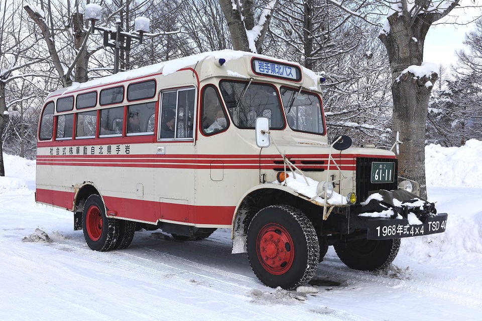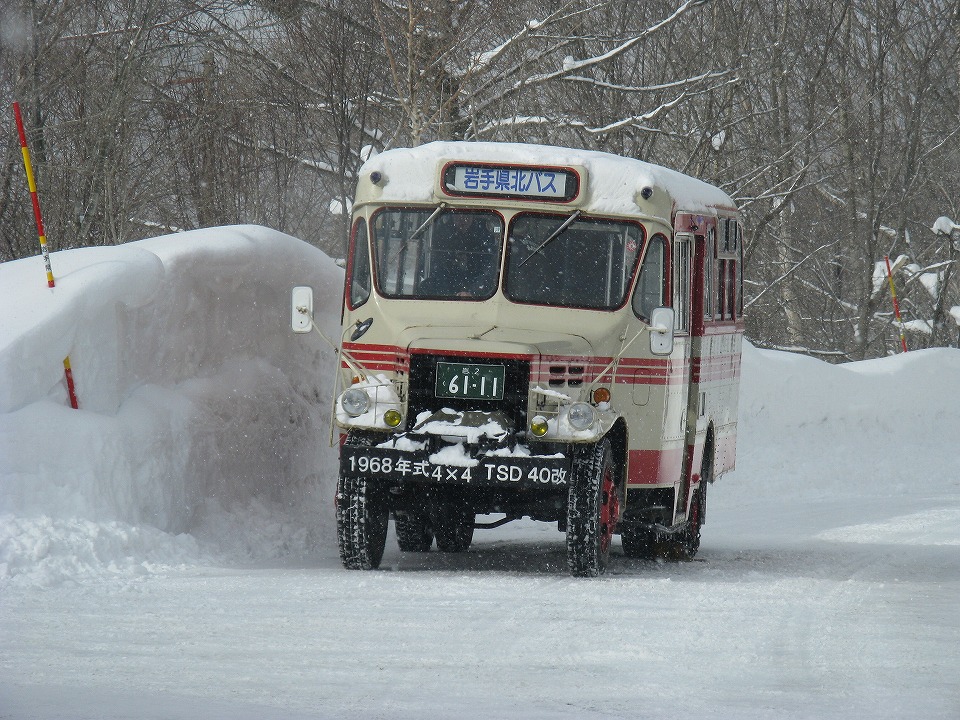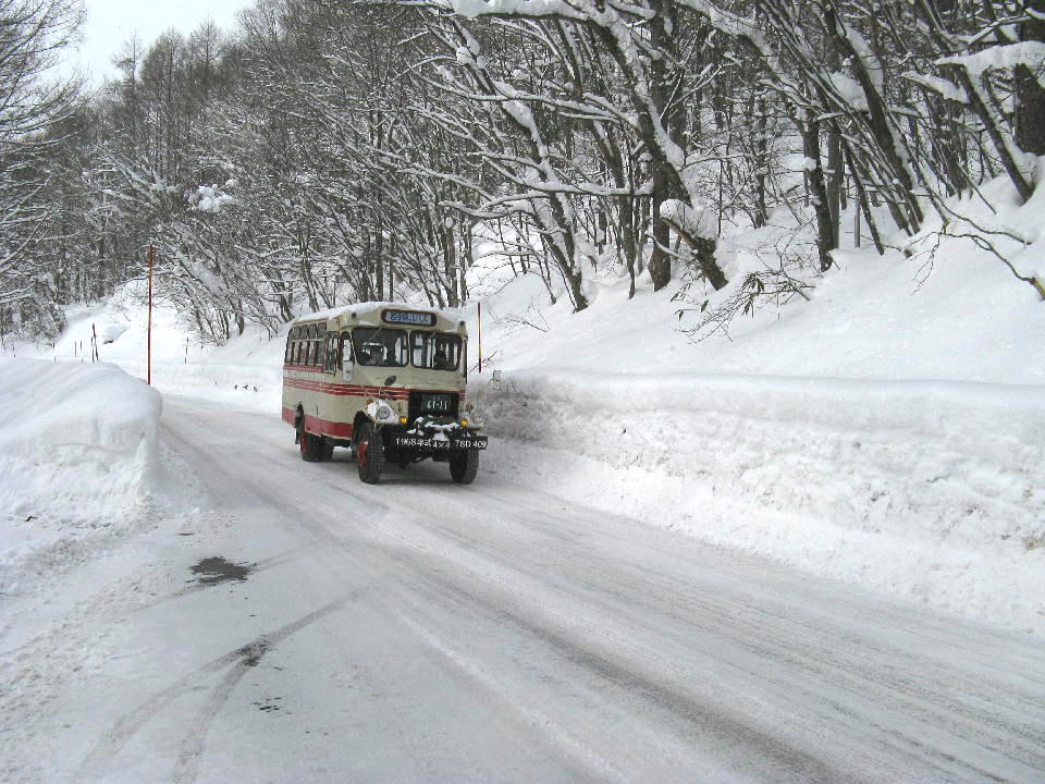 | 折り返し便が通っていった。 果たして対向車も、ボンネットバスの後続車もなかった。 もちろん動画でも撮影している。 約24秒の動画はこちら。 この写真は、周りの雪景色も入るように、 わざと広い範囲のアングルで撮影。 |