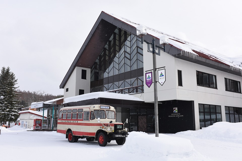 | 盛岡バスセンターからの「現代のバス」が定刻どおりに到着した。 行き先表示が「松川温泉」になってるところがおもしろい。 「現代のバス」は松川温泉までは行かないので、 この ボンネットバスに乗り換えましょうね~。 「松川温泉」行きのバスは、基本的(春~冬前の雪のない時期)には この写真のような「現代のバス」が全区間を運行しているが、 雪の多い冬季は「現代のバス」は登坂性能に心配があるので、 力持ちのボンネットバスが「八幡平マウンテンホテル」~「松川温泉」 の区間を部分的に担当しているため、乗り換えが必要だ。 ただ、取材日の状況を見ていると、乗り換える客はほとんどいなかった。 ※ボンネットバスが修理などでもし運行できないときは、 「現代のバス」が4輪にチェーンを巻いて走ることもあるそうだが、 「安心感が全く違う」そうな(運転手さん談)。 |