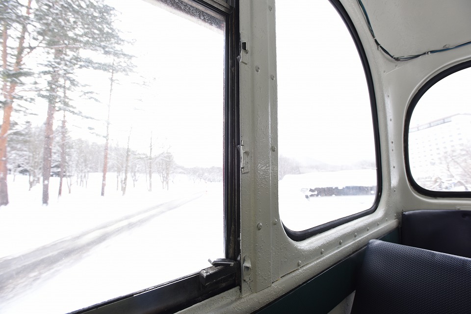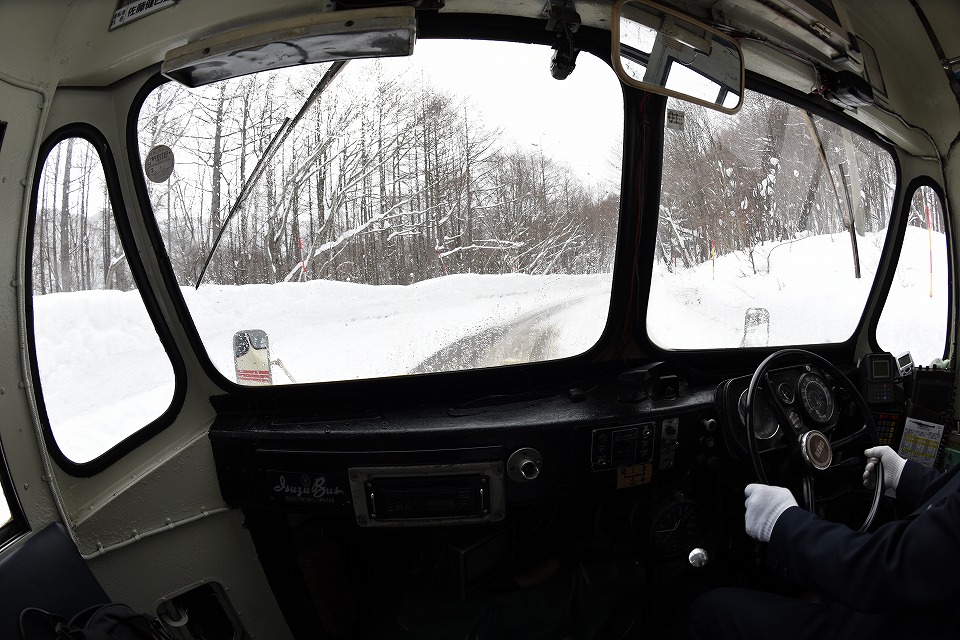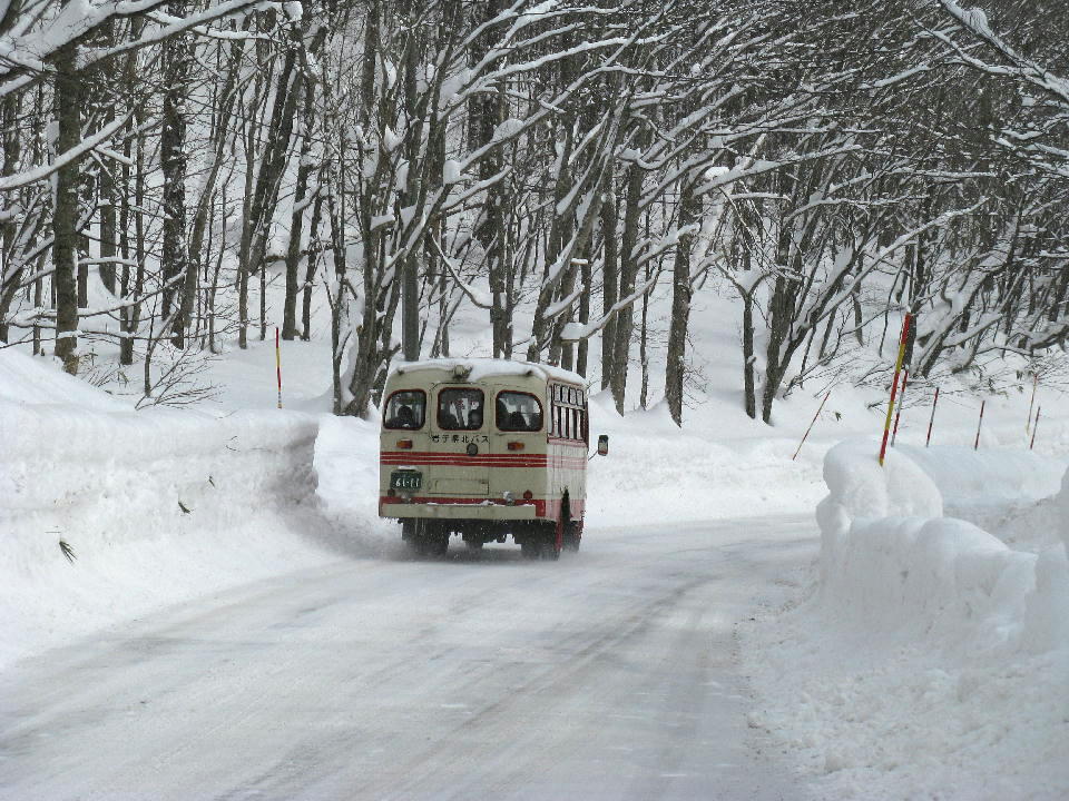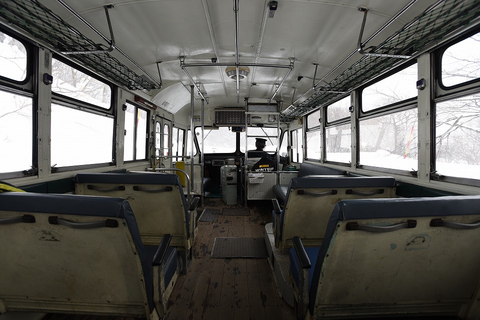 | 午後の便は、最前列のシートを確保した。 座席の向きは進行方向ではない「山手線タイプ」だから、 前方を撮影するには体をひねる必要がある。 この写真は静止画だが、動画でもたくさん撮影した。 松川温泉に向けて、急斜面をグイグイ登る。 雪道をゆっくり走る39秒の動画はこちら。 |