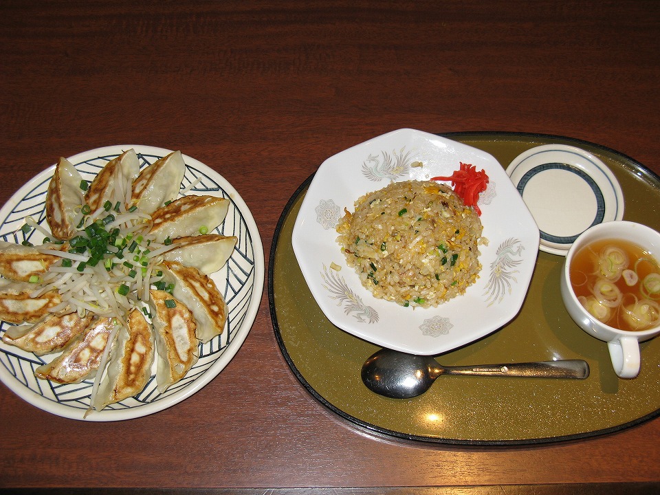 | 焼き餃子12個649円ナリと、半炒飯418円ナリ。 どちらも旨いが、 俺的には餃子はもうちょっとニンニクが効いててもいいかな。 |