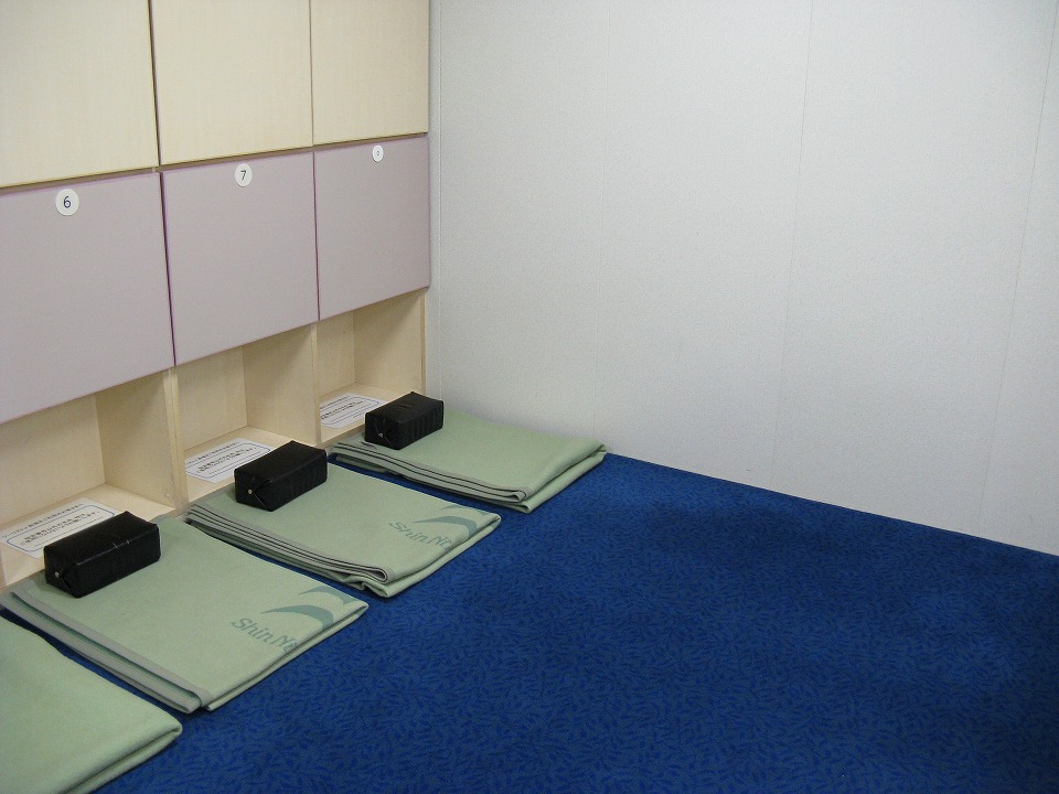 | 今回の席は「J1-0」だって(写真の1番奥。)。 席番が「0」ってのがおもしろいね。 12人部屋の区画に、3人しかいなかった。 |