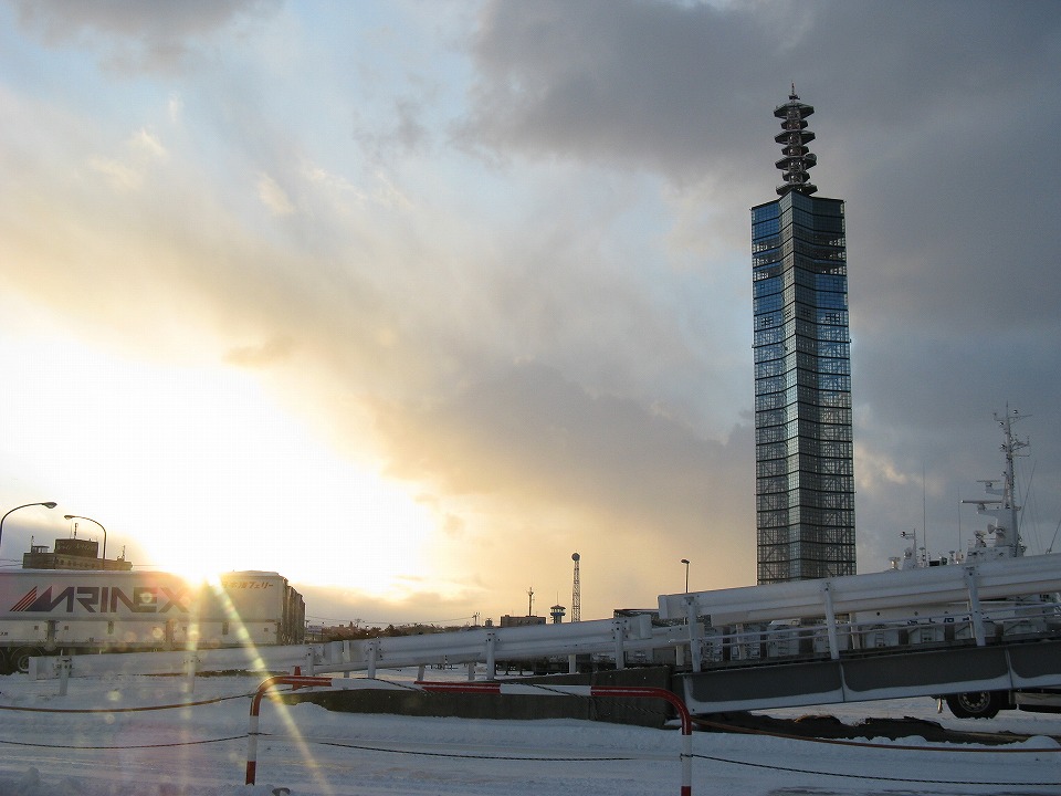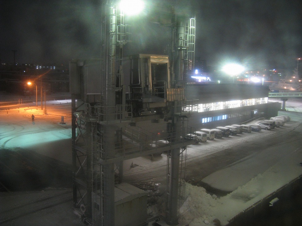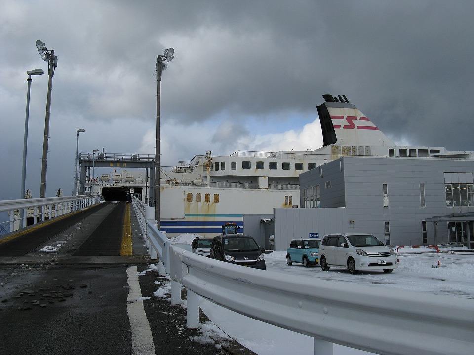 | おはよ~さんです。 夜の間の雪は幸い大したことなく、 クルマの雪除けもすぐに終わった。 フェリーターミナルで乗船を待つ。 |