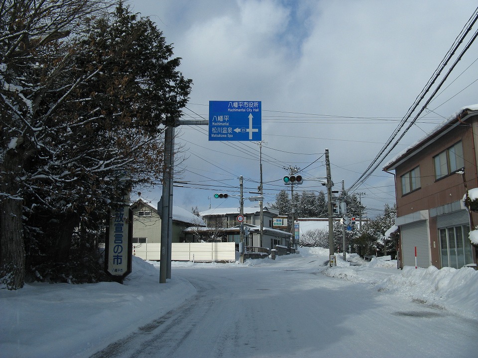 | 西根I.C.からボンネットバスの終点の「松川温泉」を目指す。 バスの始発の「八幡平マウンテンホテル」はもう出発している時刻なので、 終点の「松川温泉」に行って、 バス停での折り返し待ちと、折り返し便の走行シーンを撮影しようということ。 松川温泉までのかなりの上り坂を、滑りながらえっちらおっちら走った。 |