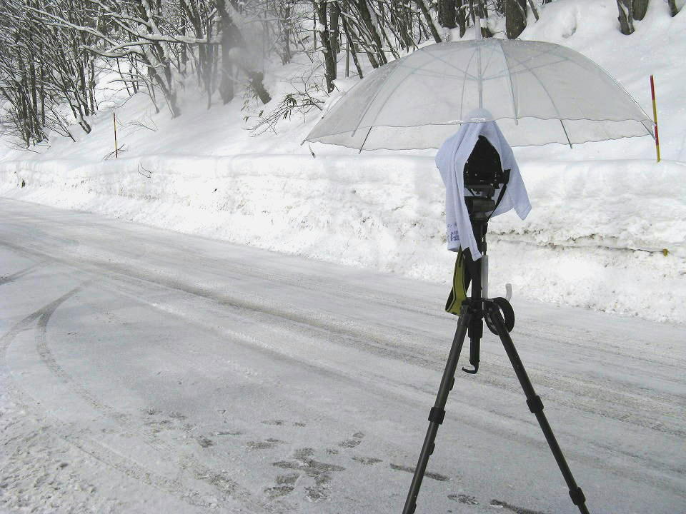 | バス路線の道をちょっと戻り、道路脇に車を停められて、 しかも人工物があまりない場所を見つけ、動画撮影の準備をした。 雪が舞い、それが風でレンズのフィルターに付くので、 こういう条件の時は気が抜けない。 撮影直前までは当然レンズキャップをしておく。 腹が減っているので、 折り返し便が来るまでの間に、サンドイッチや小岩井牛乳で朝メシ。 たまにこの道を通るクルマ(大抵は温泉客)が 怪訝な顔でこっちを見る。 「こんなとこで三脚構えて、サンドイッチ喰ってる」ってね(笑)。 ボンネットバスが通る対向側でカメラを構えているので、 ちょうどやって来たときに、対向車が来たら目も当てられないけど、 果たしてどうなるか。 |