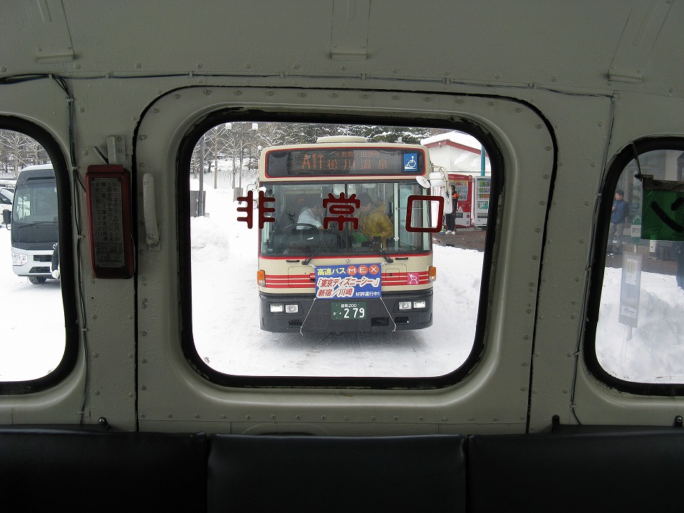 | 松川温泉に着いて、折り返しの便の出発まで、 バスの中で待機させてもらえた(外で待ってたら寒かったろうな~。)。 帰りは、客は俺1人。 運転手さんに聞いたら、 特に平日は客がいない(いわゆる「空気輸送」)のときもあるんだって。 俺に言わせりゃ「もったいない」だ。 |