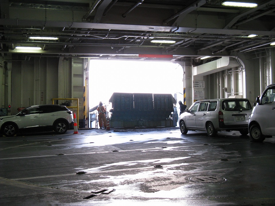 | 苫小牧までのクルマから乗船が始まったが、 このクルマはドライバーが戻ってこないので、 1台だけ取り残されている(笑)。 |