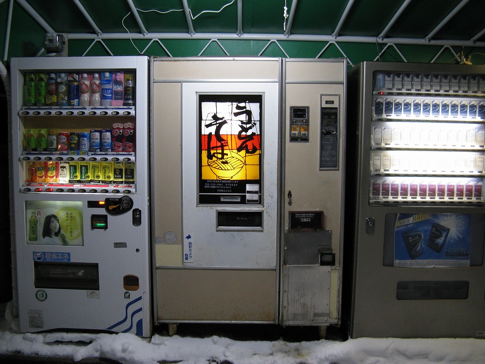 | 新潟から北陸道などで長野県入りした。 フェリーの中では何も喰っていないので ハラが減りまくっている。 信濃町の蕎麦屋「ふじさと」の敷地内にある 「う・そ自販機」に寄る。 |