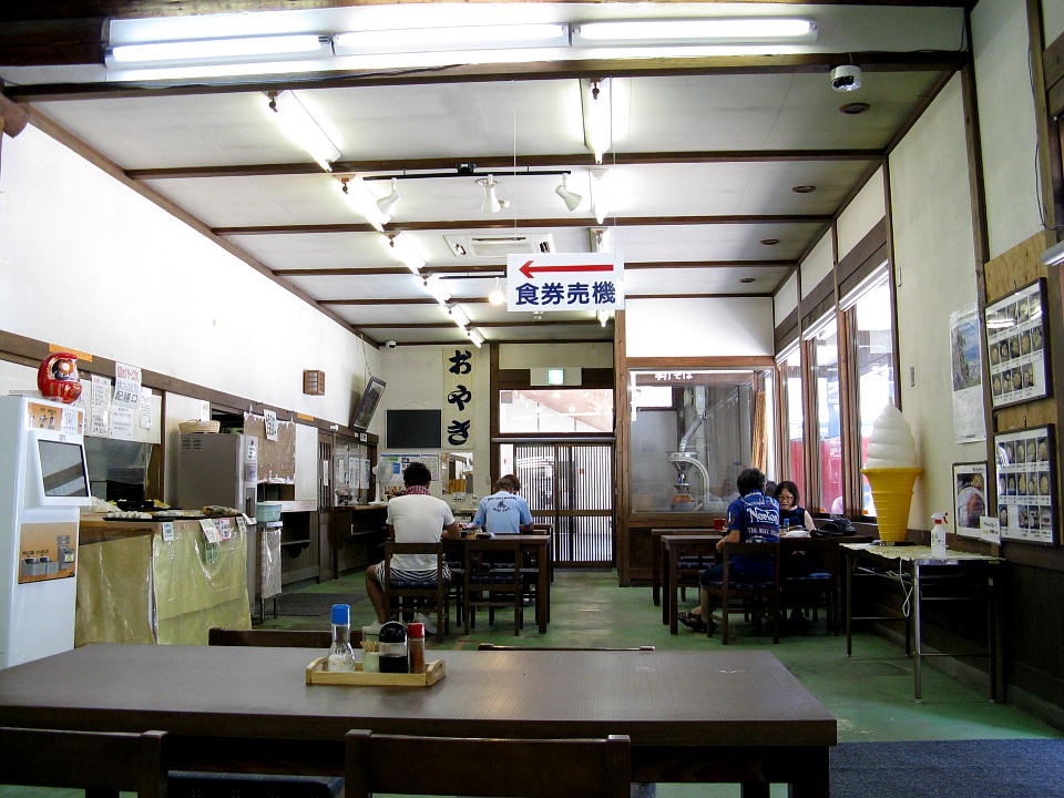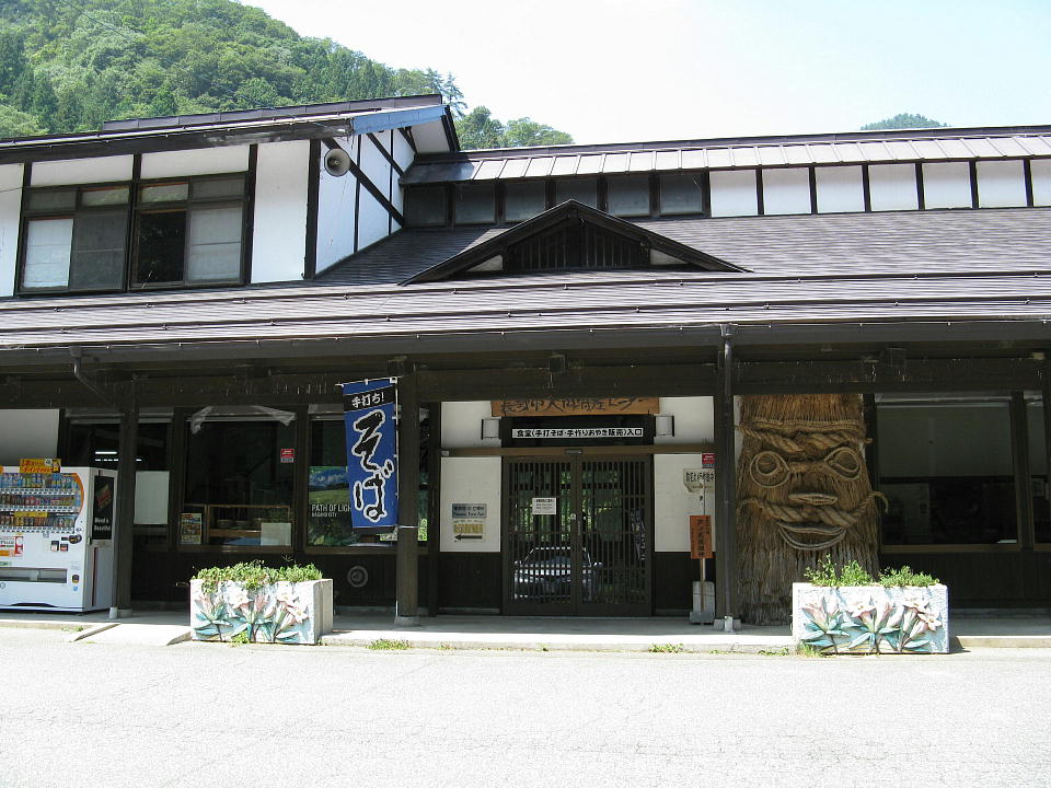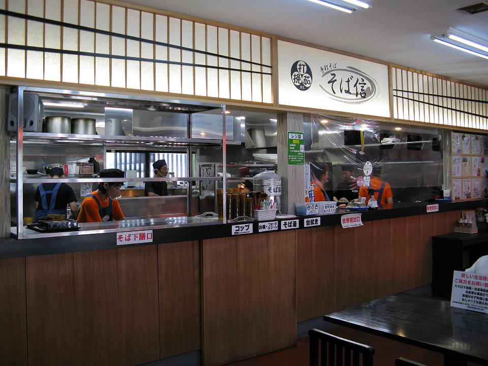 | 道の駅「信州新町」に入っている蕎麦屋の「そば信」。 ひっきりなしに客が行き来するが、 この写真はほんの僅かな無人のときに撮影したもの。 |