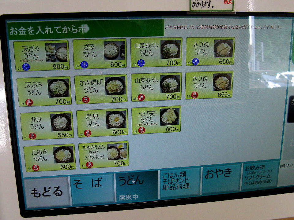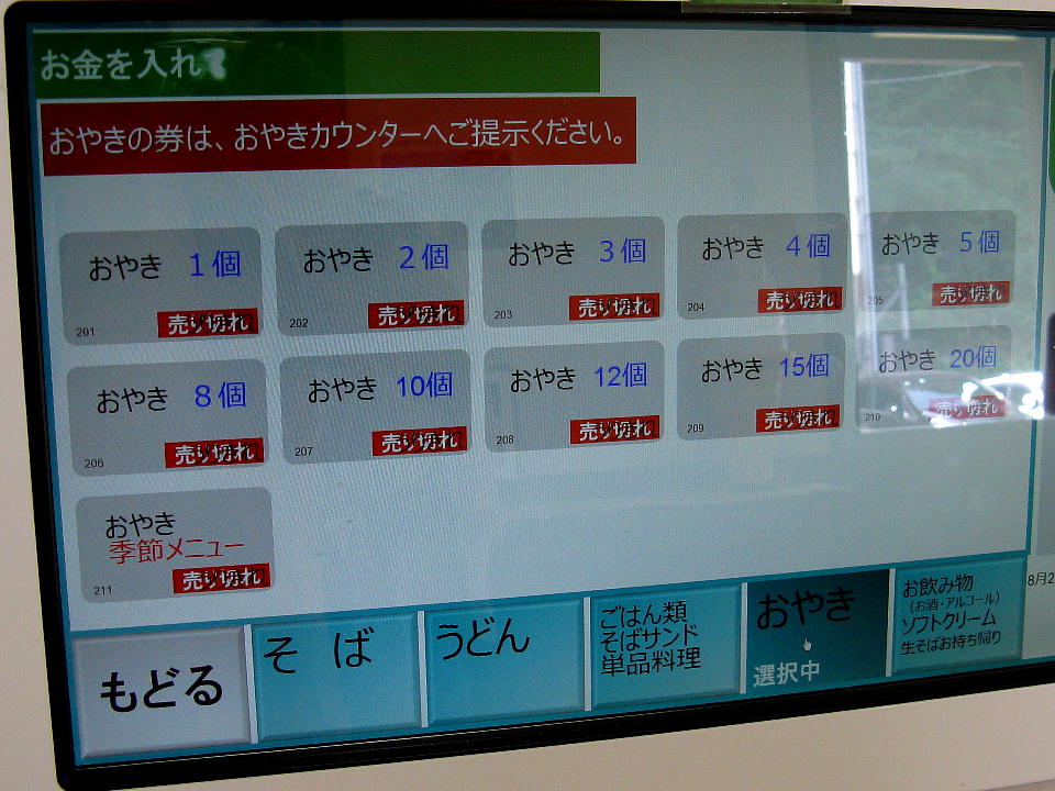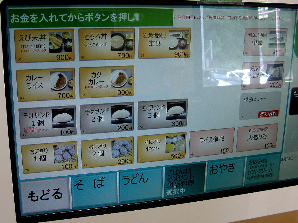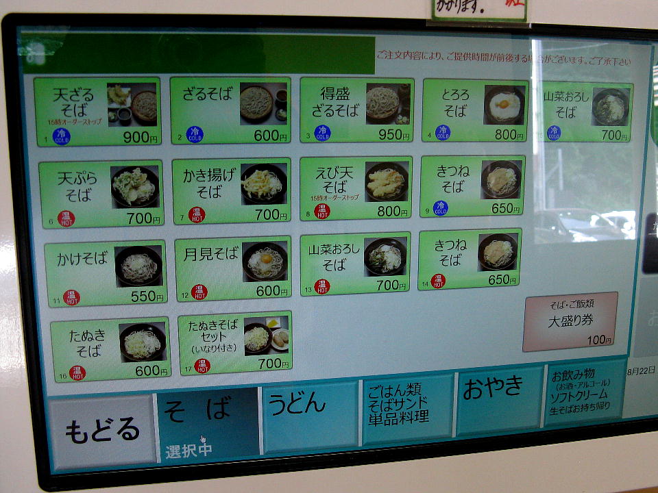 | ここも自販機で食券を買う方式だが、 全ての献立がボタンに現れているので、 買う列に入らずちょっと離れたところから見ながらじっくり検討できる。 おススメ度が高い献立ほど上段寄りの大きなボタンが与えられるんだと思う(笑)。 さっきの「大岡タイプ」だと、券売機のスペースは節約できるが、 そば、うどん、食事、おやき、と画面表示を変更させて選ばないといけないので、 時間がかかる上に「一目」で選ぶことができない。 優柔不断な人はいつまでたっても決められないと思う(それはこっちでもおんなじか?)。 後ろに並んだ人にも迷惑だよね。 ただ、ここのようなタイプの券売機でも、順番がきていざ券売機を目の前にした段階で 献立の検討にかかる人がいるんだな~(やっぱこっちでもおんなじだ(笑)。)。 俺はもちろんざるそば一択だ。 【後日追記】 冷やしたぬきそば600円ナリも、旨いことを確認しましたよ。 |