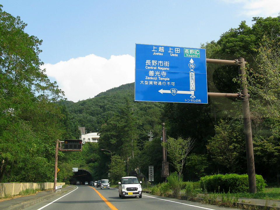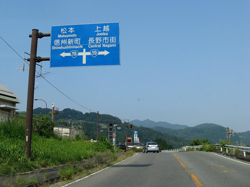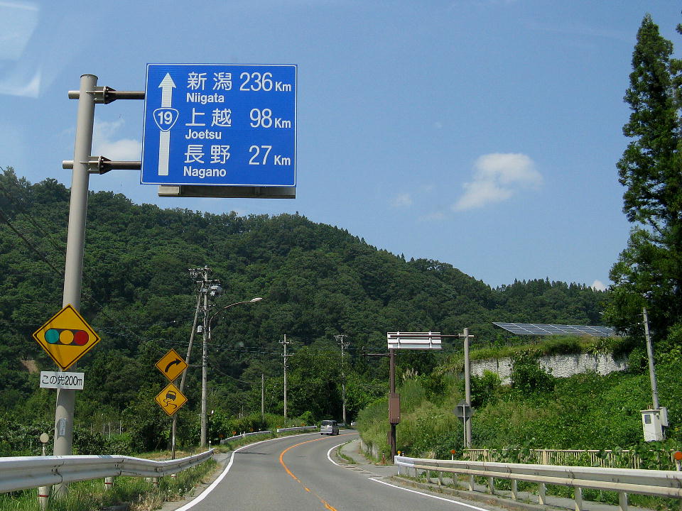 | 満足して、次の道の駅「信州新町」に向かう。 国道19号を長野市街方面に戻る。 青板に新潟が出るんだね。 新潟なんて国道19号とは何の関係もないのに、 こういう地名の選択はどういう基準になってんのかね。 上越も国道19号とは関係ないもの、 終点の長野で国道18号に入ればそのまま行けるから、 まあ分からんではない。 |