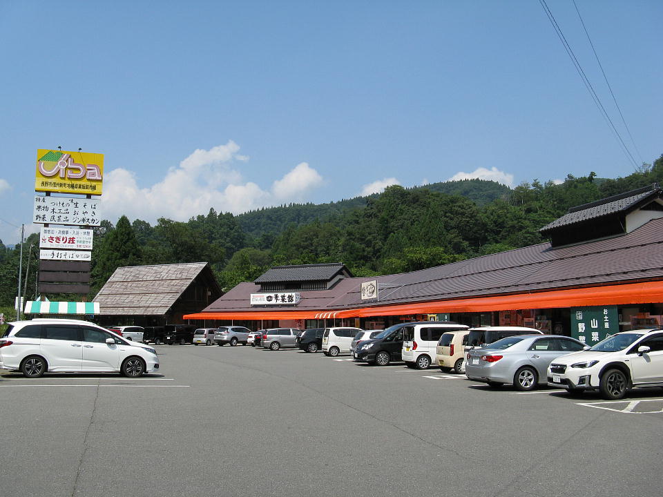 | 道の駅「信州新町」の全景。 こっちはさっきの「大岡」と違ってかなり混んでいる。 気温もだいぶ上がってきて、暑いゾ。 |