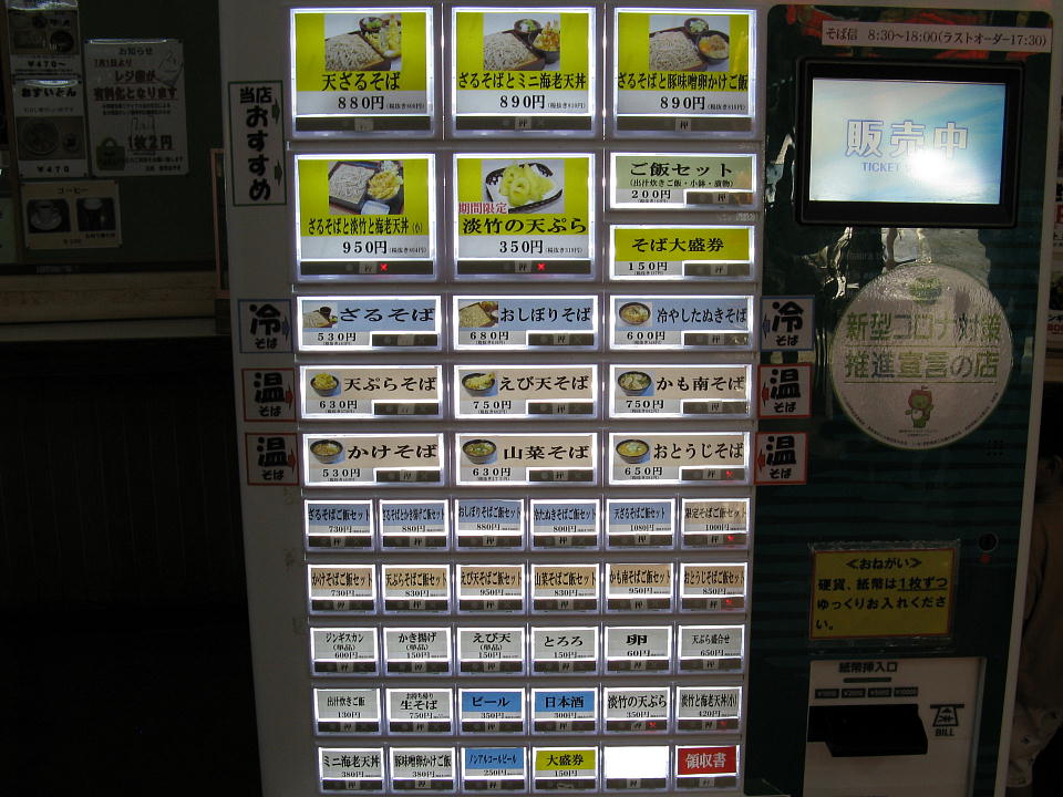 | 新しいタイプのタッチパネル式食券販売機が導入されている。 今回はざるそば一択だ。 |