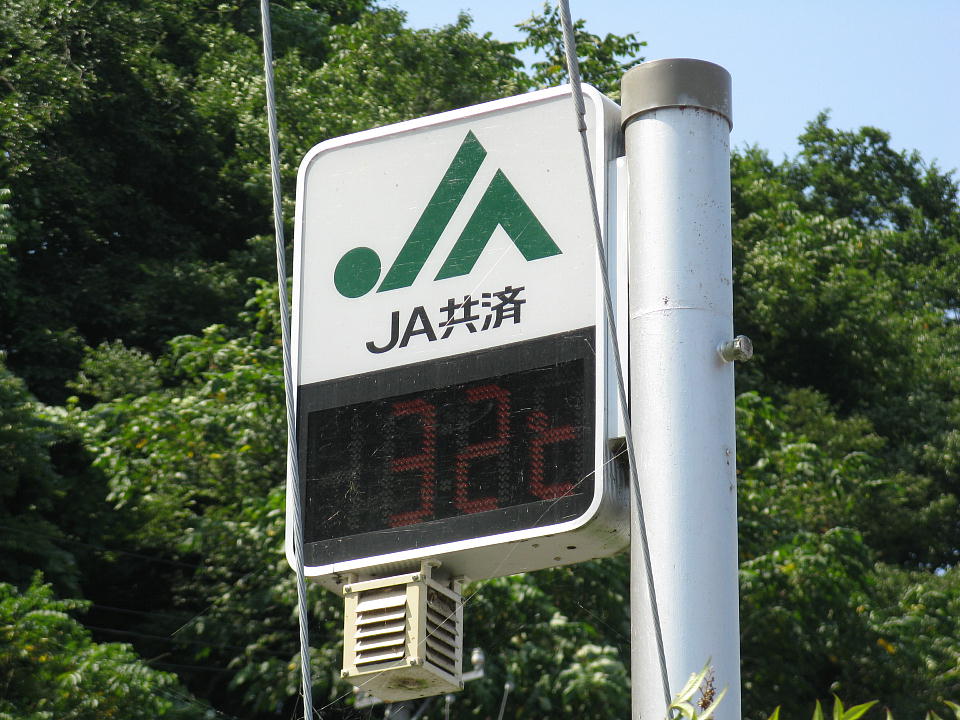 | すっかりホヘッとして外に出たら、暑い暑い。 道の駅の片隅に立っていた温度計は32℃を表示していた。 最高で35℃ってのも別なとこで見たよ。 |