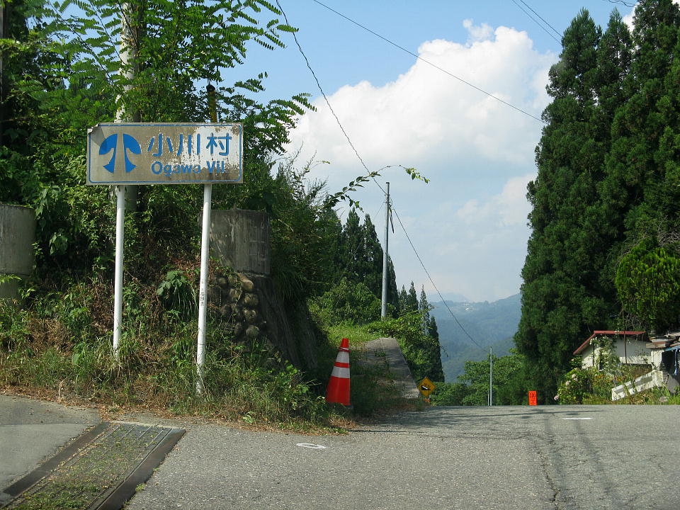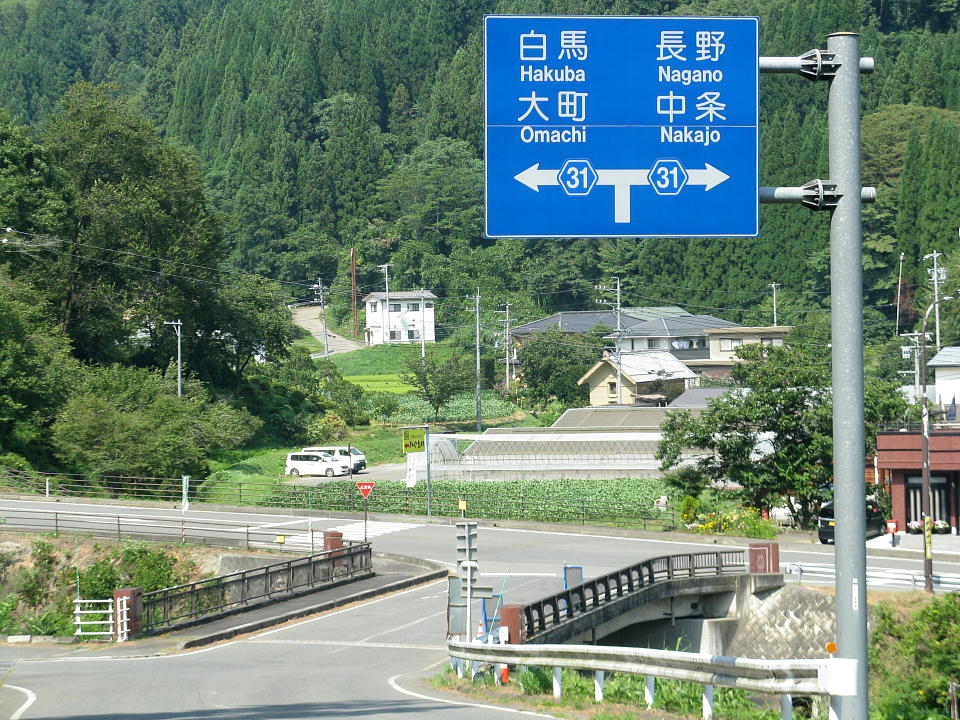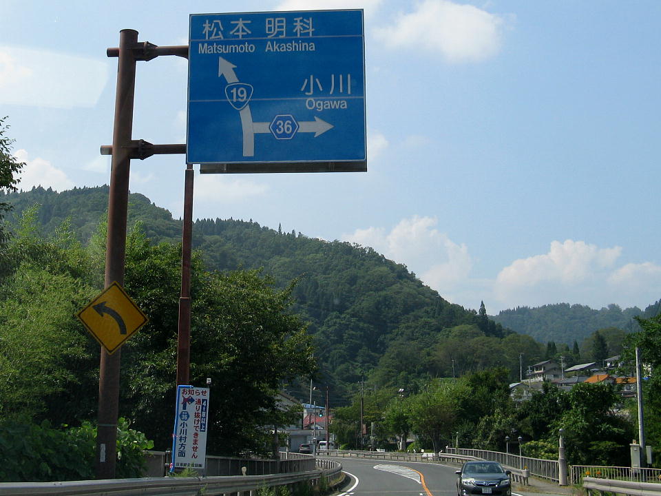 | 十分旨い蕎麦を2枚手繰ったし、 もう帰ろうかと思ったのだが、 帰るにはちょっともったいない気がしたのと、 久しぶりに真夏の山道を少し走ってみたいのと、 せっかくだからもう1軒ぐらい蕎麦を喰いたいと思ったことから、 国道19号を数キロだけ松本方面に走り、 信州新町の町なかにさしかかる手前で、小川方面に右折する。 |