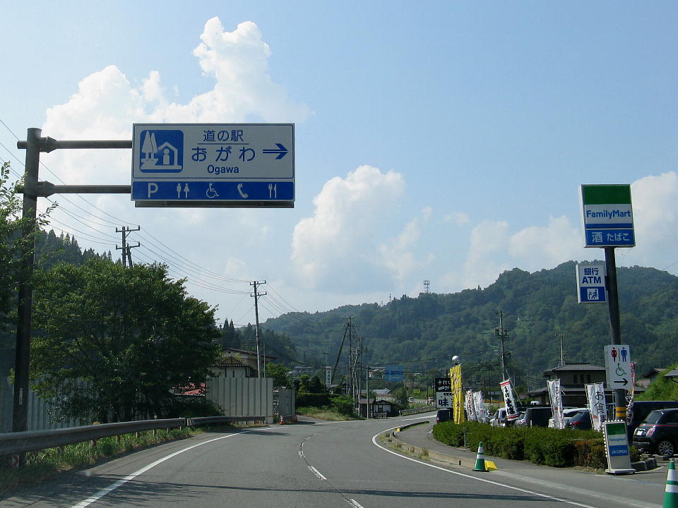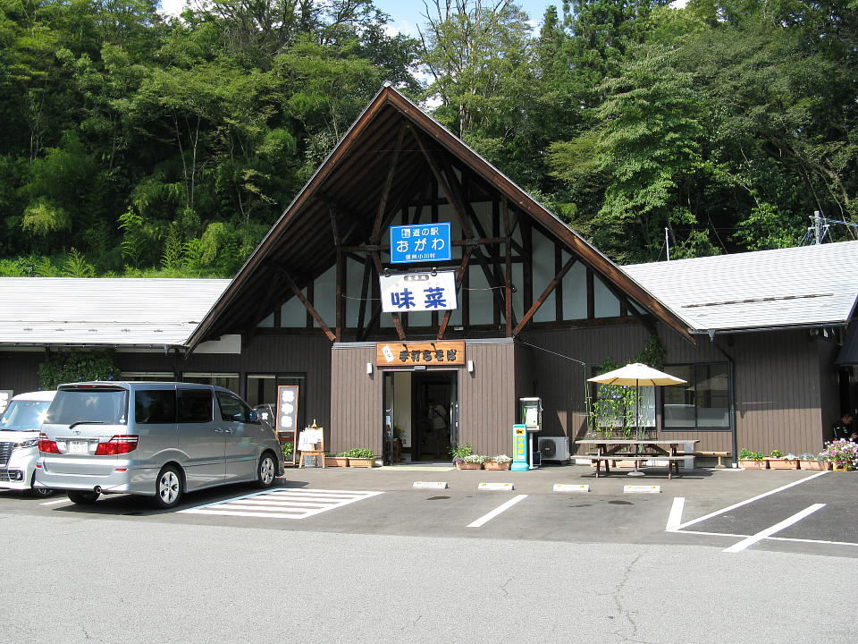 | さっきの交差点を左折してすぐに 道の駅「おがわ」がある。 ここでも手打ち蕎麦食せるはずだ。 あとから写真を見て気付いたが「手打そば」の幟も立ってたね。 |
