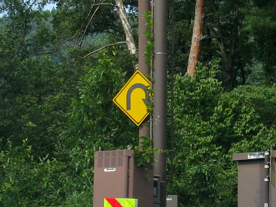 | まるで180゜のカーブがあるようだが、実際は約90゜。 でもこれぐらいオーバーに表現しておかないと、 このカーブにエラい勢いでさしかかり、曲がりきれずに突っ込む恐れがあるんだろうし、 ここまでやるってことは実際に事故があったんだと思う。 特に夜に大型車が飛ばしてきたら曲がりきれないぐらいのカーブだからね。 |