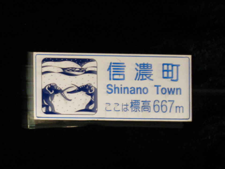 | 昼前に出発して、名古屋へ通じる国道19号を松本方面に向かう。 小1時間で最初の目的地、道の駅「長野市大岡特産センター」が近付いてきた。 この写真は、コンデジの設定をよく確認せずに ストロボを炊いてしまったもの。 ストロボの光が、反射材を使っている案内板までちゃんと届いているね。 半逆光なのに、案内板だけが浮き上がっているように見えるでしょ。 |