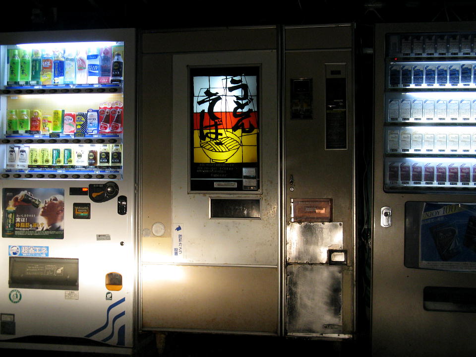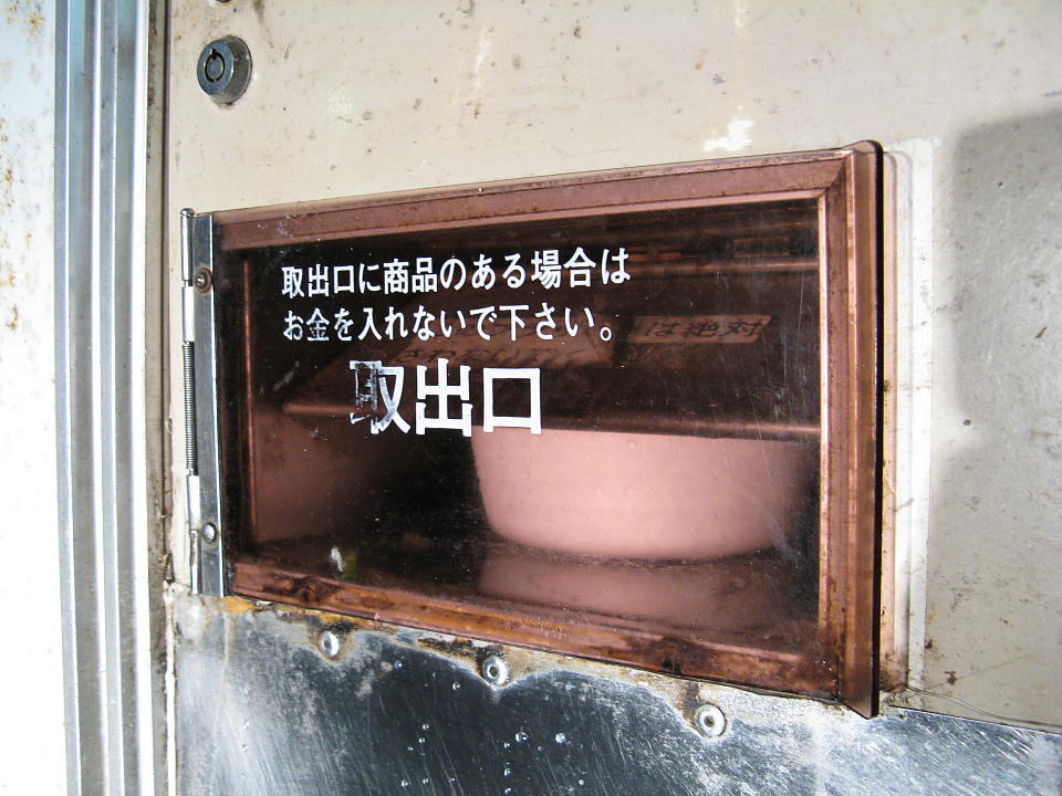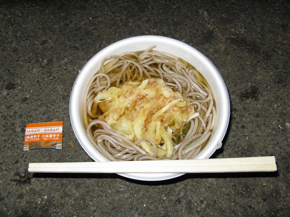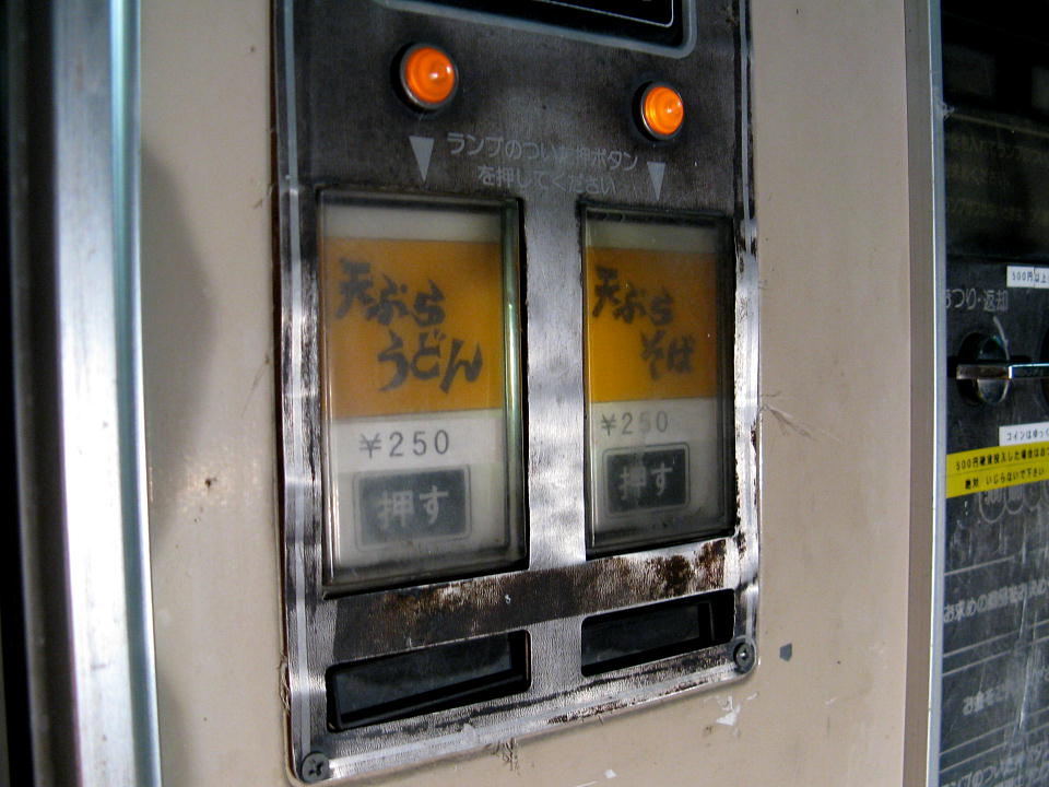 | 週末の夜ということもあって売り切れていたら残念だと思っていたが、 幸いうどんもそばも選択できた(お金を入れてランプが点いている。)。 もちろん今日は天ぷらそば一択。 |