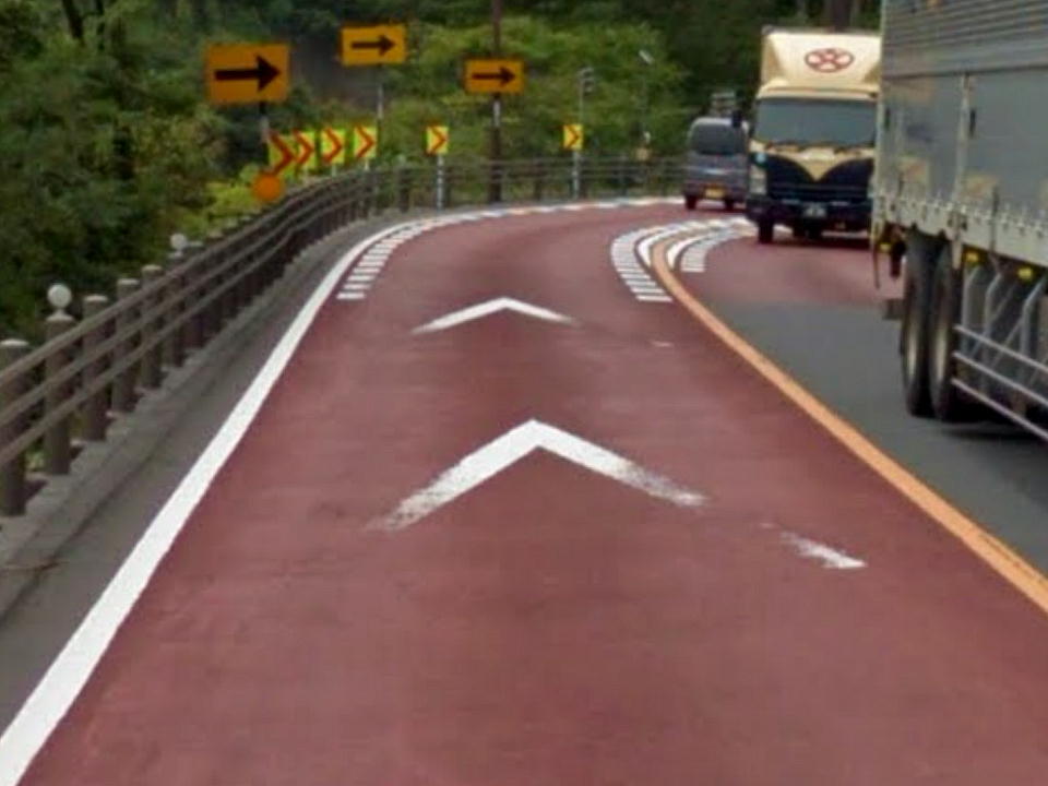 | そこでストビューで確認してみたら、 2018/09の時点では赤い舗装だったんだね。 道路左側の標識2つもないね。 |