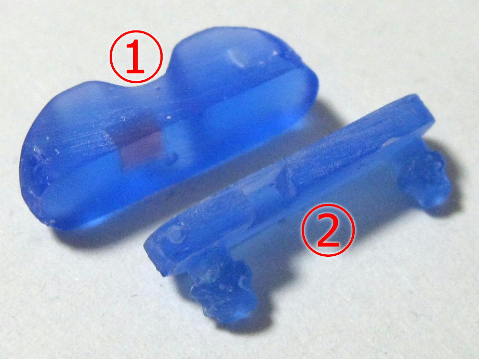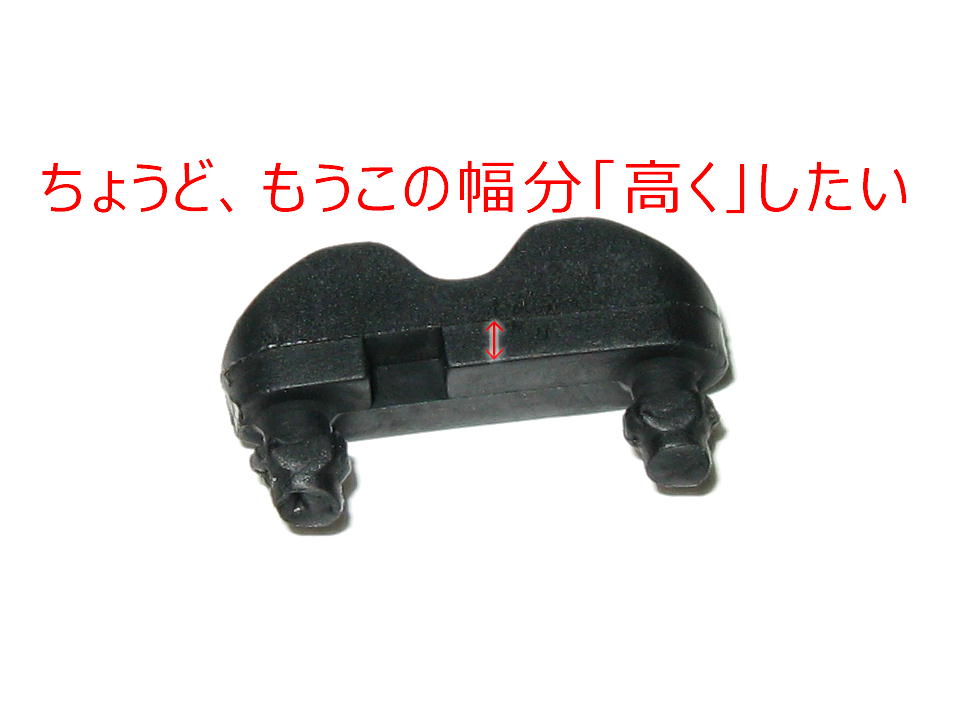 | いくつも作ったうちからデキのいい個体を加工する。 切断する位置を変えて、 ①:アタマ(カメラのモードスイッチに当たる部分)+(高くしたい)幅 のものと、 ②:(高くしたい)幅+脚 の2つを作る。 |