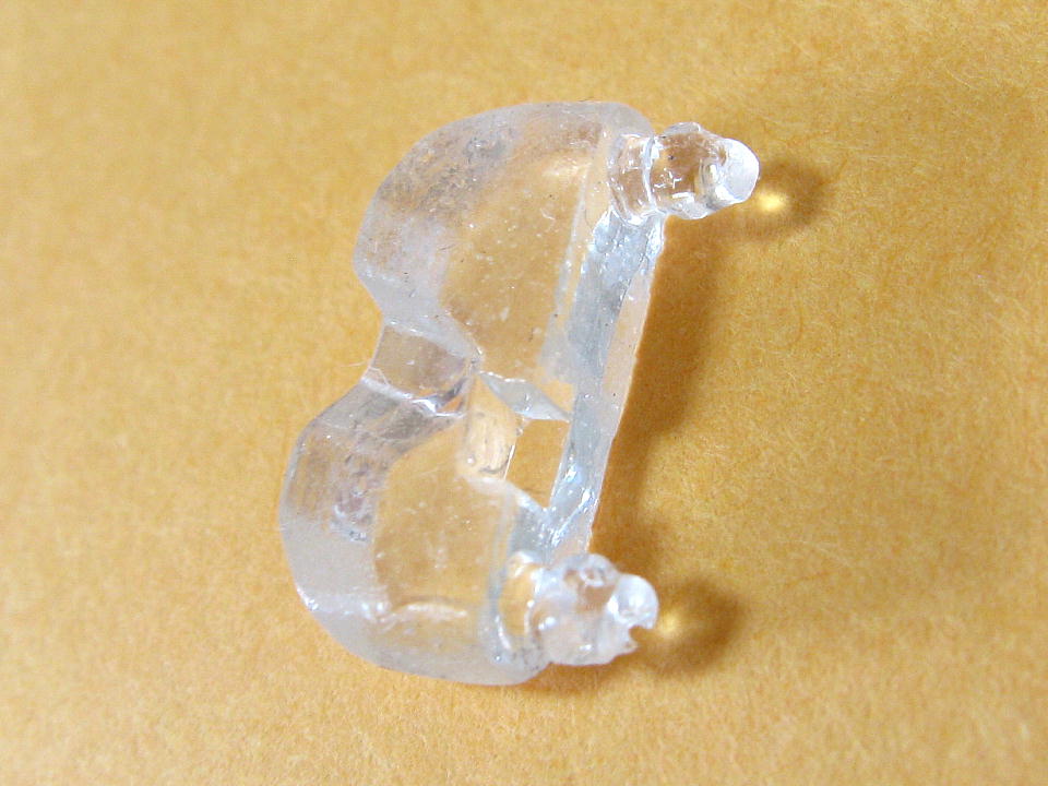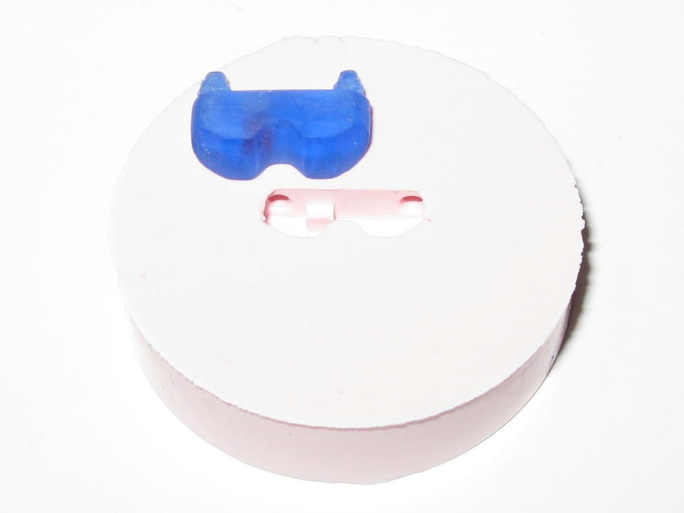 | では、次はこの原版の型取りをする。 「この原版をハウジングに付けちゃえばいいんじゃないの」、と思うかもしれないが、 弾力がある状態のもので完成させないといけないので、まだ作業が残っているのだ。 この原版はカチンコチンに硬くできているため、 仮にこのまま使うとしても、コンデジの硬いモードスイッチにカツンと当たることは避けたいし、 そもそも「脚」の膨らみの部分が、取り付ける「台」の穴を通過してくれないのだ。 |