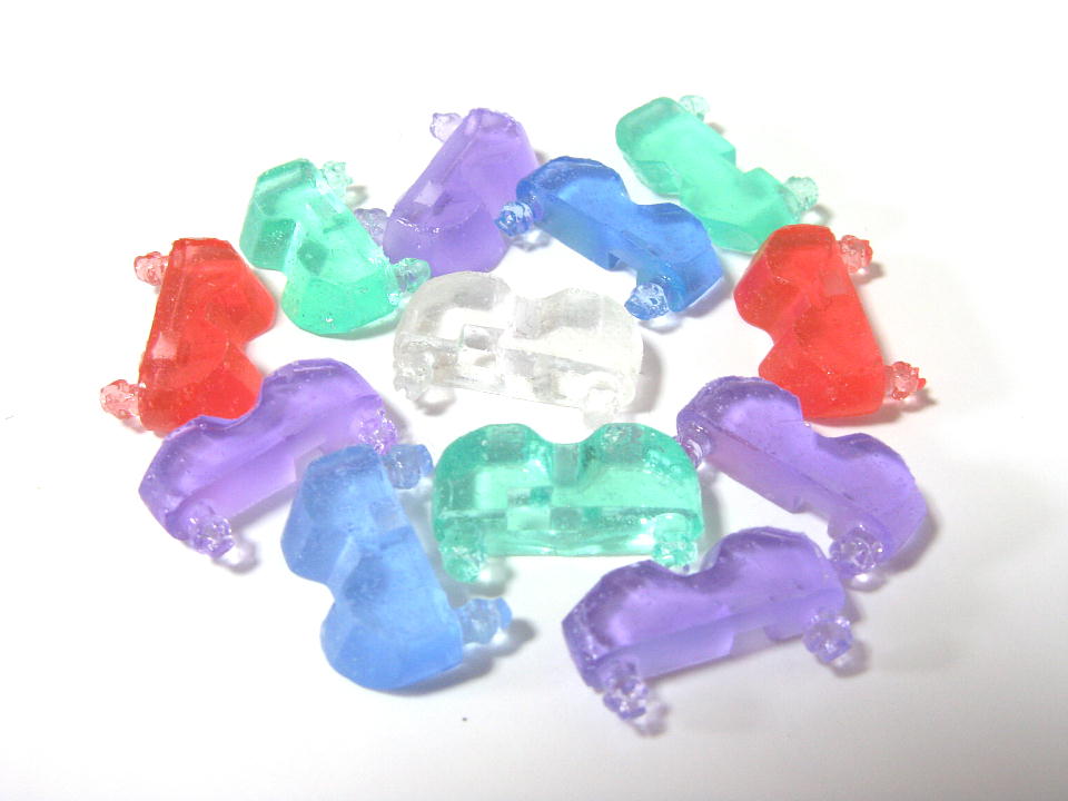 | おもしろがって、いろんな色でいくつも作った。 この時点で問題になったのは、「脚」の部分がうまくできていないものが結構多いことだった。 これはつまり、レジンを成型樹脂に流し込むときに、 空気(気泡)を徹底して取り除かないといけない、ということだ。 今回の部品には2本の「脚」があり、特にこの「脚」の膨らみが重要な役目を果たす。 この「脚」の膨らみが台となる部品の穴を通過することでロックするようにしっかり取り付けられるため、 この「脚」の部分を特に丁寧に作成しないと、不良品になってしまう。 レジンを注いだ成型樹脂の「脚」の部分を思いっきりギュッと押して空気を押し出したり、 爪楊枝を使って気泡を潰す。 ありがたいのは、UVで硬化するタイプは、2液レジンのように刻一刻と硬化することがないということだ。 太陽やUVライトに当てない限りすぐには硬化しないので、ゆっくり落ち着いて作業ができる。 |