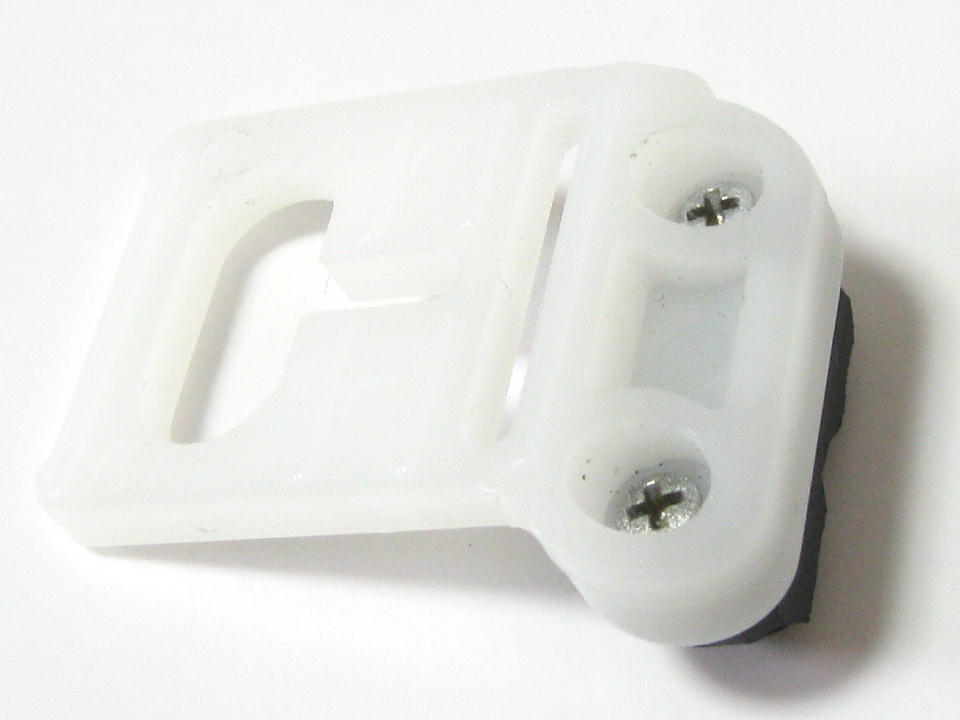| 切り出したゴムを、ジャンクのコンデジから外した極小ネジを使って固定している。 ネジを通しているところは、本来は部品の「脚」が通る部分なので、 最初から穴が開いていて都合がいい。 この方法でとりあえずは使えていたのだが、 そのうち、どういうタイミングかで、水中で操作していると、 この部品と、コンデジのモードスイッチがとが滑ってしまい、 モードスイッチを操作できなくなることが時々あって、困っていた。 |