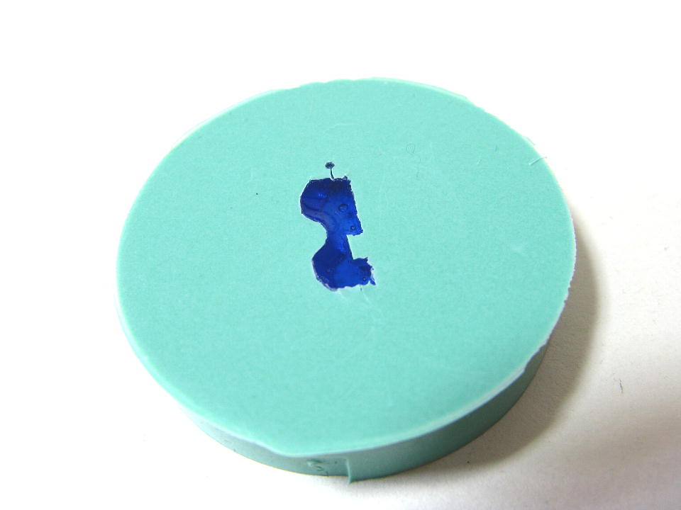 | 【参考】 気泡を無視して硬化させるとこのようになる。 まあ、この部分にレジンを垂らしてすぐ固めることを繰り返して、 ちょっと盛り上がるぐらいにまでしてからナイフや彫刻刀で削って成形してもいいけど、 ウツクシクないよね…。 |
