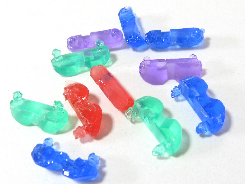 | 作成したかった部品がやっと完成した。 結果論だが、ハードとソフトをテキトーに1:1で混合してみたが、これがなかなかによかった。 ただこれは、この部品を作る場合のいい比率ということであり、 他の作業でもこの比率がBESTなのかどうかは分からないよ。 今回もいろんな色で作ってみた。 今回作成した部品は特に酷使する部品ではないが、 レジン部品の耐久性がどの程度なのかは分からないので、予備として多めに作ってみた。 ちなみに、真ん中の透明なのはソフトタイプだけで作成したちょっと柔らかすぎたもの。 なお、作成直後はちょっとベタ付き感があるが、太陽光に数日さらせば収まる。 |