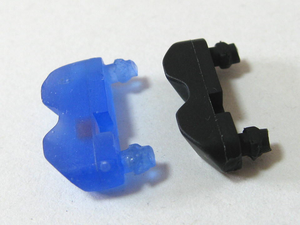 | 左が完成した原版。 右の本来の部品に比べてちゃんと「高く」なっているでしょ(笑)。 なお、原版の「脚」の根元近くに気泡が入ってしまっているが、 表面に出てるわけではないし、今回の場合見た目は関係ないので、問題なし。 |