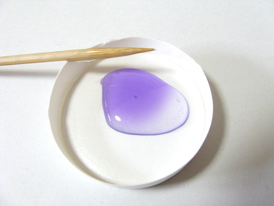 | これまで使ってきた「Seria」のハードタイプのレジンと混ぜてみることにした。 100均の紙コップを切って皿のようにし、 そこにハードタイプとソフトタイプを目分量でとりあえず1:1ぐらいで出してみる。 写真は、ソフトタイプのレジンを出した左側に、 紫色のハードタイプのを出して、かんます前のもの。 ハードとソフトの「合わせ目」が少しずつジワーッと合体する。 きれいなグラデーションが生まれる。 そして、気泡が入らないように注意しながら、よぉ~くかんます。 |