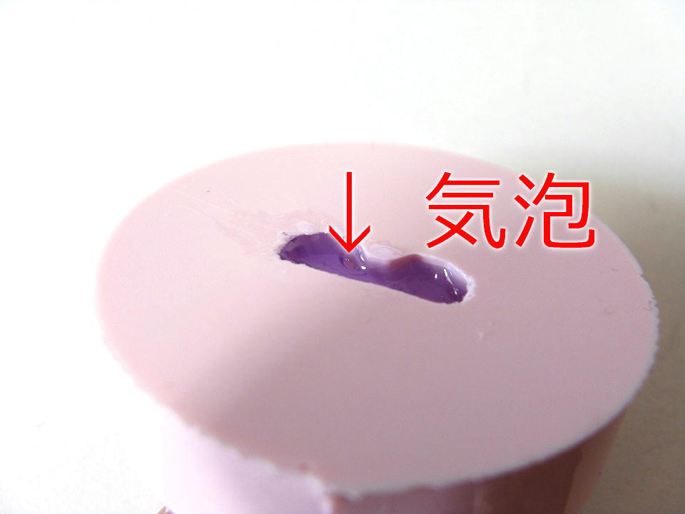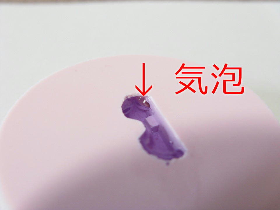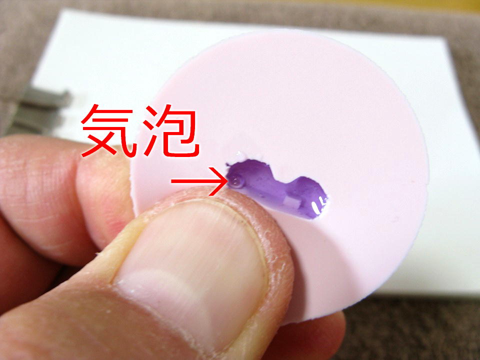 | ここにも気泡がある。 UVライトなどを当てない限り簡単には硬化しないので、 潰しにくい小さな気泡は、少し時間をおいて上に浮いてくるまで待っていても、取り除くことができた。 |
