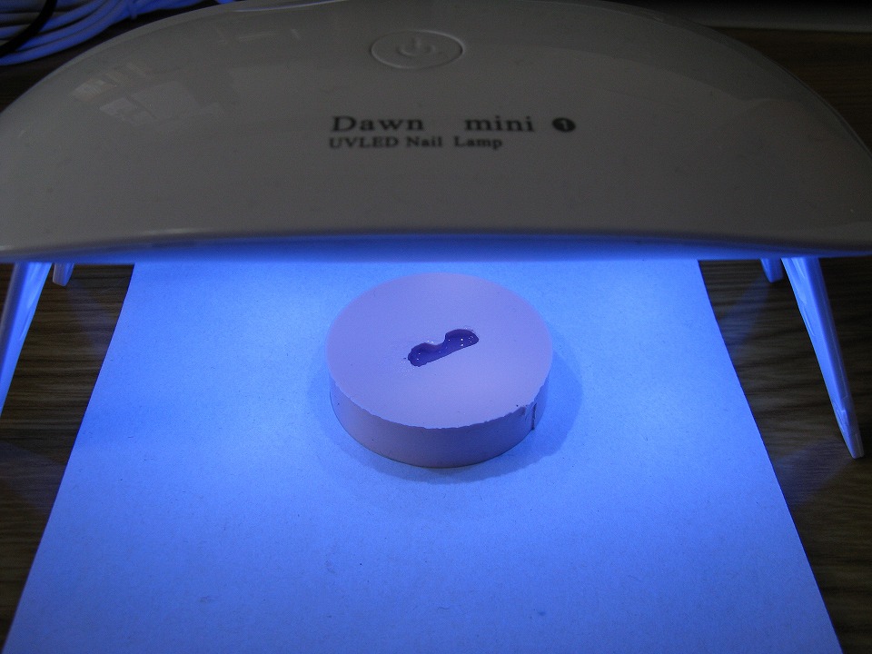 | ところで、この部品の作成途中から、USBから電源を取るUVのLEDライトを使っていた。 Amazonで550円の中国製なので、どれだけ使えるのかポチする前から懐疑的だったが、 これが意外に威力を発揮してくれた。 それまでは太陽光かピンポイントで照らす手持ち式のLEDのUVライトを使っていたのだが、 これなら脚を立てたライトの下にレジンを置いて、スイッチを入れるだけでよい。 俺がポチしたタイプは、折りたたみテーブルのようなイメージだ。 ライトは最長で3分間連続で点く。 照射後に爪楊枝の先でレジンをつついてみれば大体の硬化具合が分かる。 硬化が足りないと感じる場合は繰り返して照射すればいい。 |