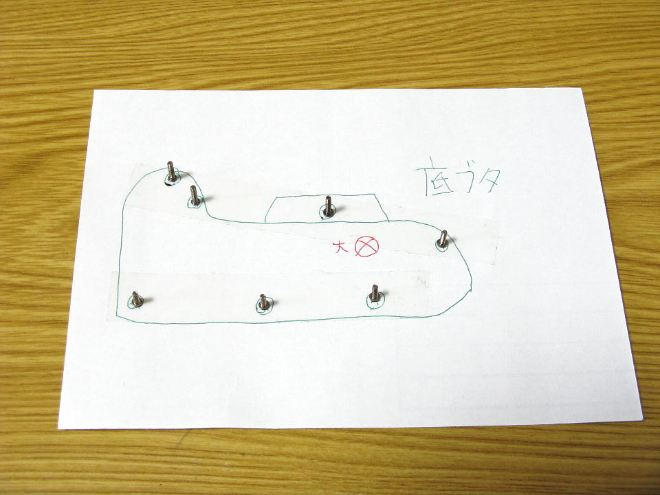 | 外したビスの保管はいろんな方法があるようだが、 俺は紙に画を描き、ビスがあった部分に両面テープを貼り、そこにビスをくっつけている。 |