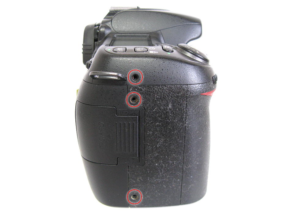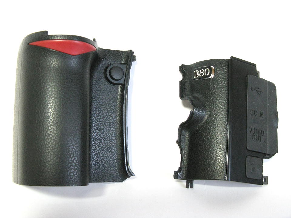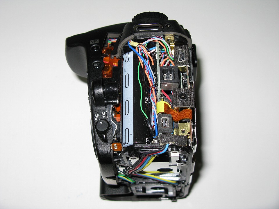 | 結果は「ムリではないけど、ビミョー。」。 というのは、D80は、左右のグリップ部を先に本体に取り付けて、 その上からレンズマウント周りの部品(「Nikon」のロゴがある部品。)を 左右のグリップ部の凸に被せるように組み付けているため、 段取りとしては、やはり、まずレンズマウント周りの部品を先に取り外すのが本来だからだ。 しかし、実際は、レンズマウント周りの部品を留めているビスのうち、 「フォーカスモードダイヤル」のビス"だけ"が付いている状態なら、 レンズマウント周りの部品はある程度カパカパするので、 向かって左のグリップ部は簡単に外れるし、簡単に組み付けられもする。 一方、向かって右のグリップ部は、上下左右にかなりこじるように動かしてみてなんとか外れ、 逆に組み付けは外すより相当苦労した。 写真は、「フォーカスモードダイヤル」のビス"だけ"が付いている状態から 向かって右のグリップ部を外したときのもの。 |