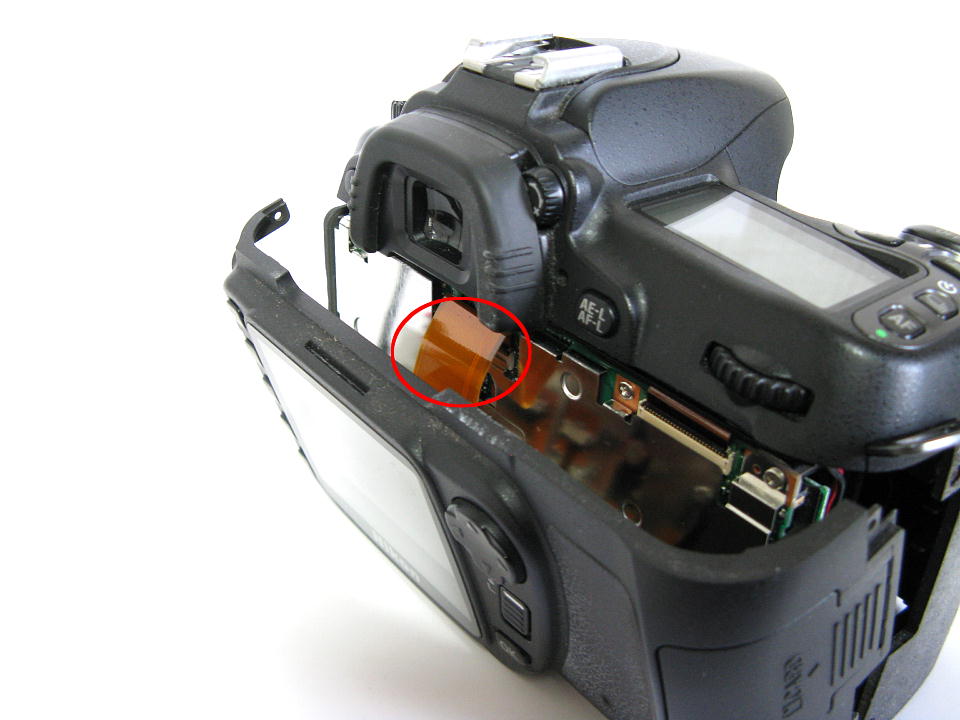 | すると背面パネルが外れる。 フレキシブルプリント基板(以下、「フレキ」)が○の部分に付いているので気を付ける。 |
