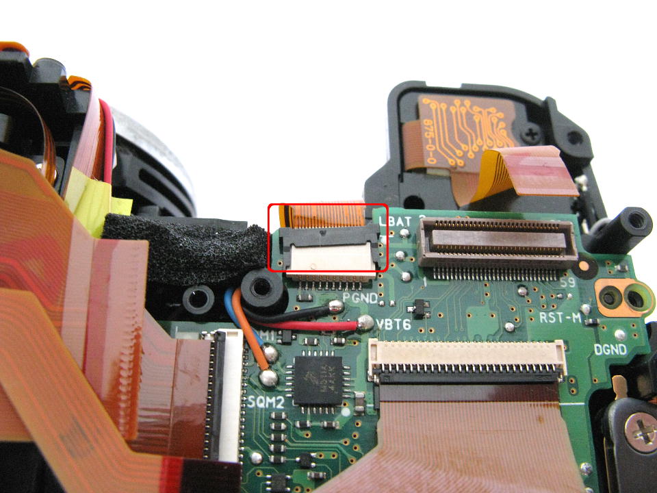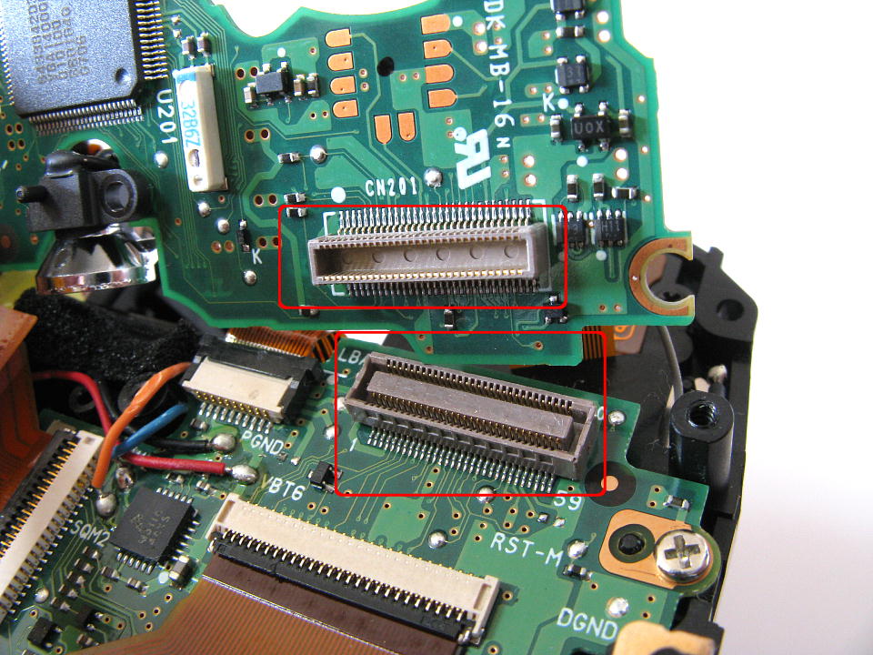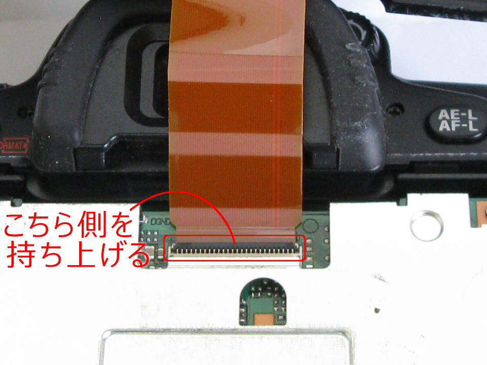 | フレキのコネクターを外す。 こういうツクリのフレキを「ZIF」タイプという(らしい)。 黒の横長の部品のフレキ側をピンセットなどで持ち上げる。 慣れないと最初はちょっと戸惑うかもしれないが、 このタイプを扱ったことがあれば大体の見当が付くはず。 外す約14秒の動画はこちら。 ※映りが悪いけどごめんなさい。 1回目のコジりは失敗し、2回目で持ち上げることができています(苦笑)。 |